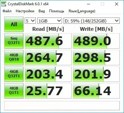 ATTO Disk Benchmark показывает нам, что PNY CS900 SSD 480Gb демонстрирует цифры близкие к максимальным уже на блоках размером 16 Кб – это типичная ситуация для твердотельных накопителей. Так же, как и тот факт, что скорости сопоставимые с бюджетными HDD (порядка 150 Мбайт/с) достигаются уже на блоках размером 4 Кб. Максимальные же цифры равны около 530 и 490 Мбай/с на чтение и запись соответственно. CrystalDiskMark по традиции показывает чуть меньшие цифры, но всё равно достаточно высокие – около 490 Мбайт/с и на запись и на чтение. При этом одним из самых показательных результатов является именно 4KiB Q32 – это тестирование случайного чтения и записи блоками размером 4 Кб и глубиной очереди равной 32. В данном случае накопитель демонстрирует вполне типичную цифру около 200 Мбайт/с.