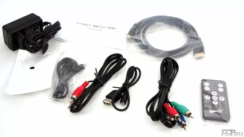 Перечислим всё то, что можно извлечь из коробки: сам плеер, наушники, блок питания (!), пульт управление, видео и аудио кабели, miniUSB-USB, USB-host кабели, miniHDMI-HDMI кабель (!), а также руководство пользователя (куда же без него).