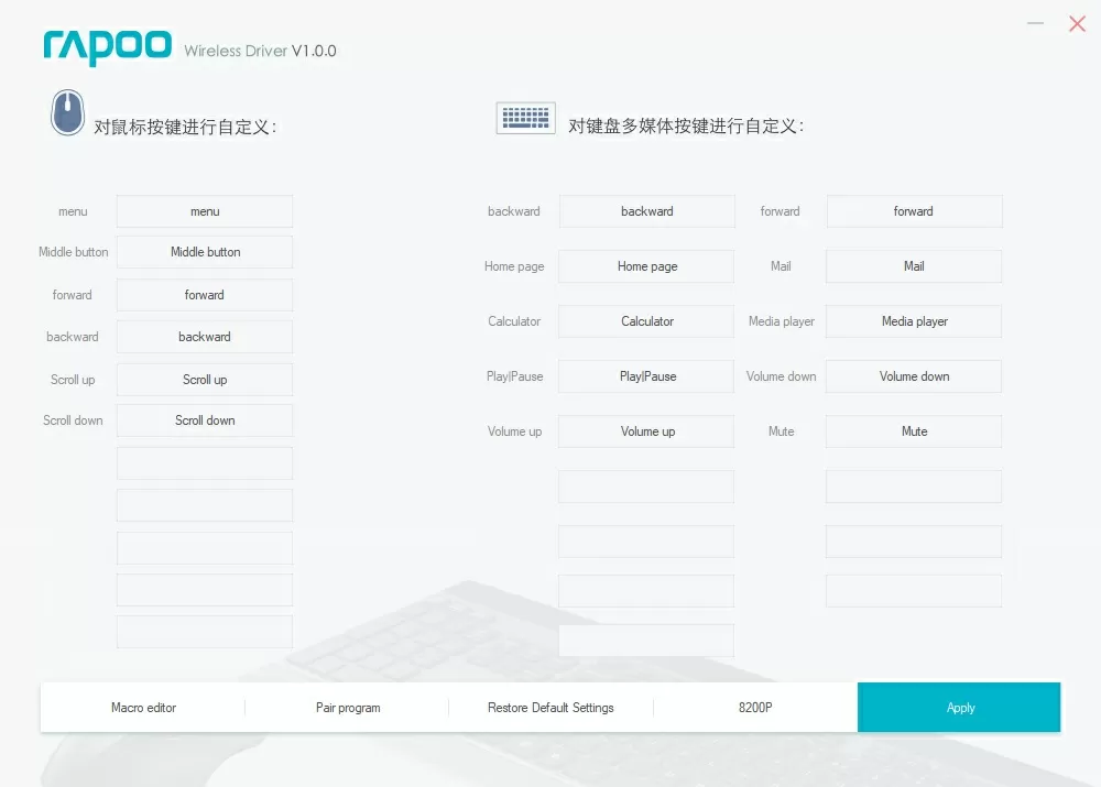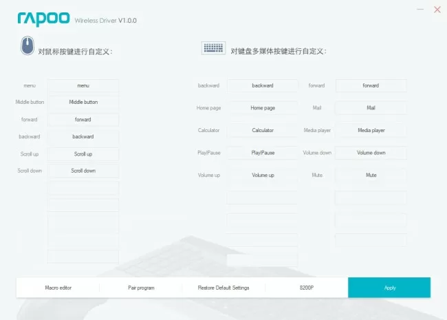 На самом деле, и этого было бы достаточно, но у Rapoo есть фирменное приложение Wireless Driver, которое служит для настройки беспроводных наборов бренда. Из доступного функционала – можно поменять назначение всех кнопок мышки (кроме основной левой), всех дополнительных клавиш на клавиатуре, есть даже поддержка макросов, что в случае с Rapoo 8200P вряд ли будет востребовано. А вот возможность поменять назначение дополнительных кнопок – это огромный плюс.
