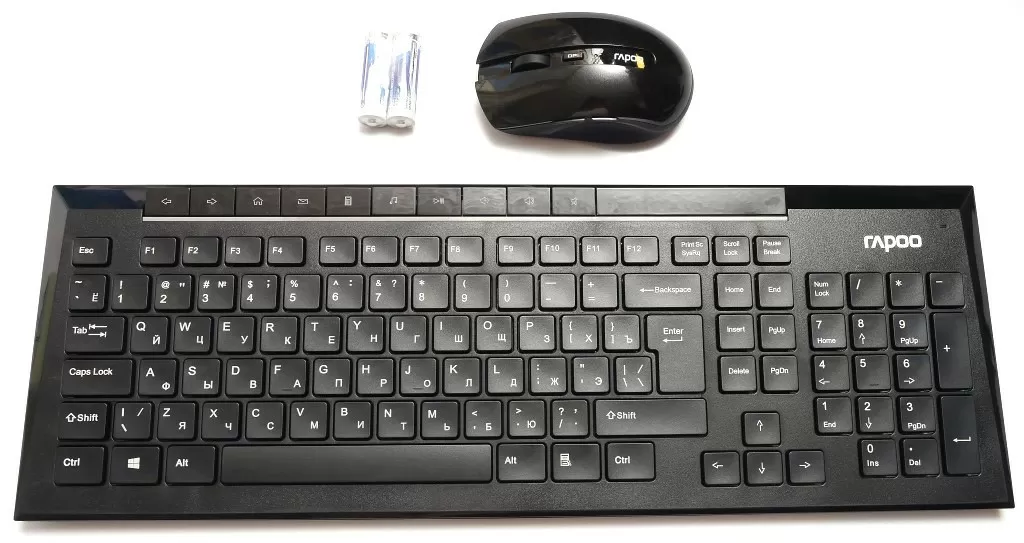 Комплектация включает в себя и комплект элементов питания. Причём особо приятно то, что и в мышке и в клавиатуре используется по одной «пальчиковой» (АА) батарейке. При этом время работы заявлено аж 12 месяцев, но даже если это и в полтора-два раза завышенная цифра, всё равно полгода работы – это более чем хороший показатель.