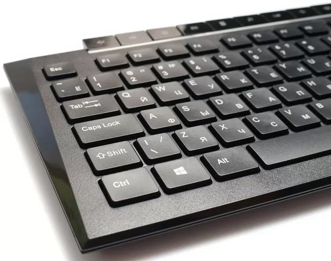 Клавиши на клавиатуре – мембранные, низкопрофильные, островного типа. Раскладка не совсем стандартная, есть отклонения от общепринятых норм. Первое – шесть дополнительных кнопок над стрелочными расположены в два столбца.
