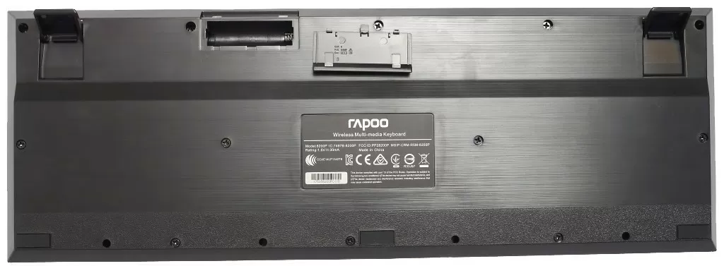 Клавиатура достаточно тонкая и компактная, но при этом тяжелая для своих размеров. Три резиновые ножки держат её на столе достаточно крепко – чтобы сдвинуть клавиатуру, приходится прилагать некоторые усилия. Есть пара выдвижных ножек для увеличения угла наклона. По традиции, кнопка включения отсутствует, так что для отключения клавиатуры придётся вынимать элемент питания.