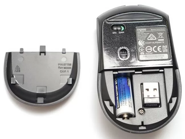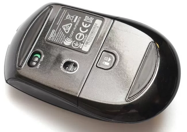 Внизу у мышки – две пластмассовые ножки средних размеров, переключатель питания, а за съёмной крышкой прячется элемент питания и нано-приёмник.