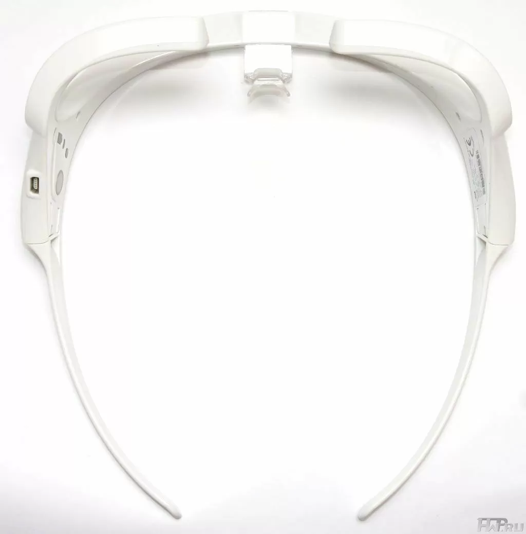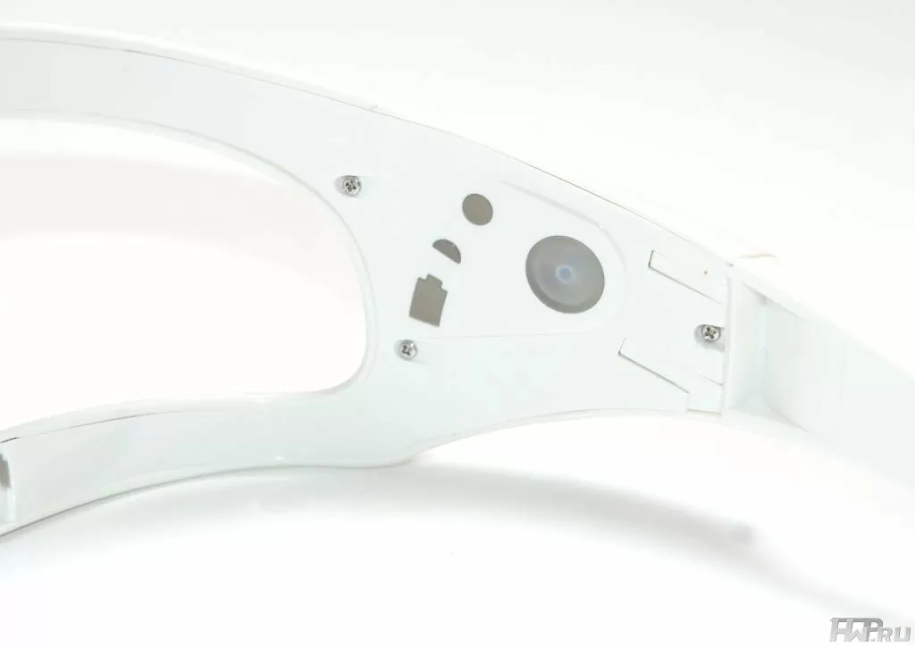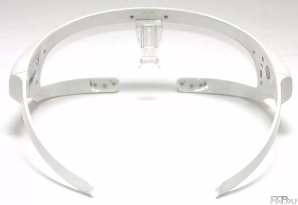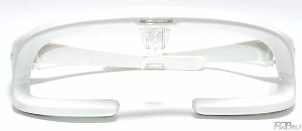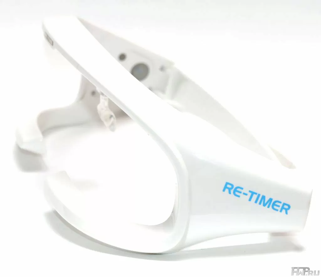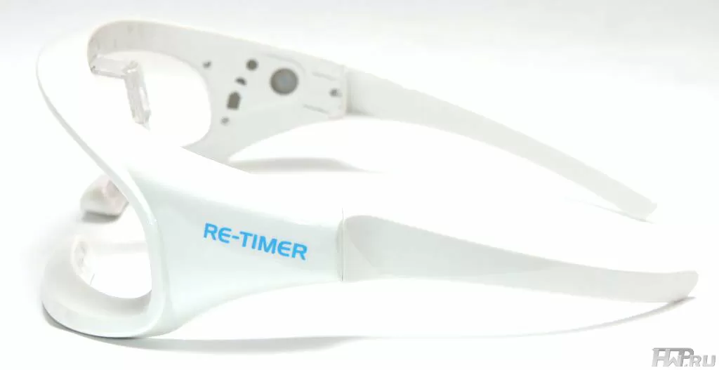Устройство полностью выполнено из белого приятного на ощупь пластика. Конструкция достаточно громоздкая, но совсем не тяжелая - вес Re-Timer всего 75 грамм ровно (мы проверяли взвешиванием на специальных точных весах). На первый взгляд, Re-Timer напоминает солнцезащитные горные очки, из которых вынули линзу. И забегая вперед, скажу, что пожалуй, линза бы тут не помешала, как минимум, на первое время, чтобы избежать лишних вопросов от окружающих.