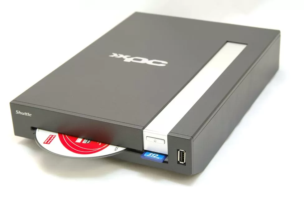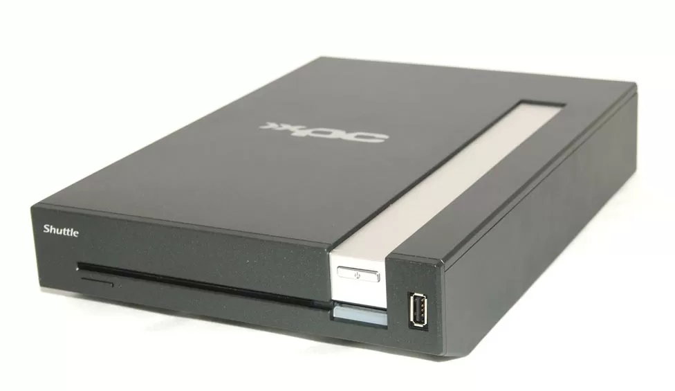 Лицевая панель компьютера практически незаметно скрывает в себе слот для загрузки дисков во встроенный DVD-привод и один слот для флэш-карточек. Дизайна минимум, плоская поверхность, чуть заметная кнопочка извлечения диска в левом углу, выключатель в правом и явно выдающийся порт USB 2.0 справа. Надпись "Shuttle" в левом верхнем углу и логотип "XPC" на крышке - единственное, что выдаёт принадлежность этой коробочки к семейству компьютеров.