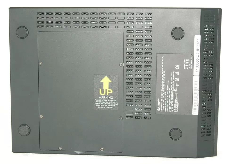 Корпус XPC X100 может устанавливаться вертикально на изящную алюминиевую подставку. В таком положении он занимает меньше места на вашем рабочем столе. Интересно, что с нижней стороны корпуса указано положение установки корпуса - только так, как показано на фотографии, USB портом вниз.