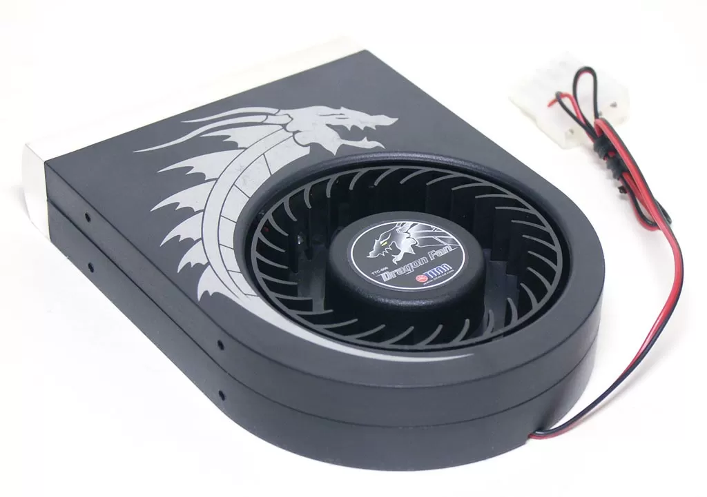 Сам кулер Dragon имеет очень красивый внешний вид: чёрный пластиковый корпус с большой крыльчаткой вентилятора и белым драконом в верхней части. Кулер подключается к блоку питания 4-контактным сквозным разъёмом PCPlug, чтобы не занимать розетку питания.