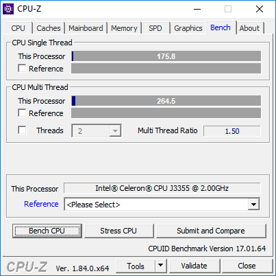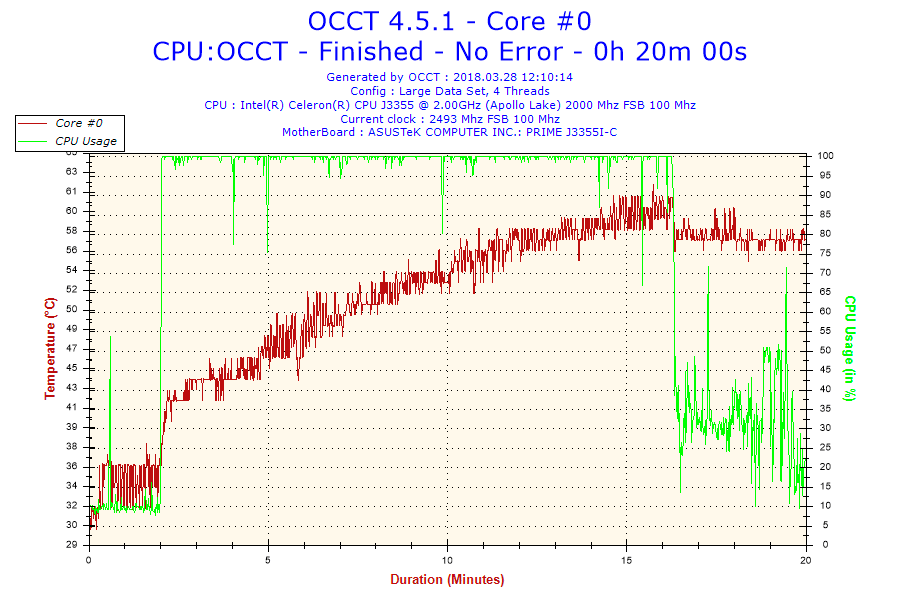 Расчетная мощность Celeron J3555 - всего около 10 Вт, так что способностей массивного радиатора должно хватить для охлаждения CPU в любых нагрузках. Тестирование Burn-In пакетом OCCT показывает, что ядро нагревается до 65 градусах при максимально допустимой - 105 градусов Цельсия.