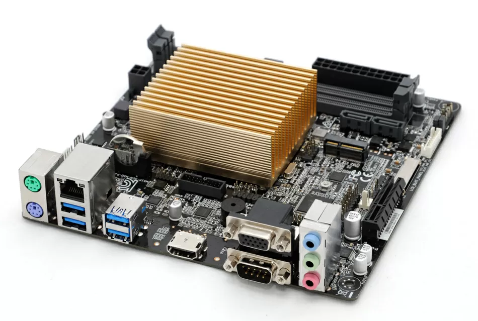 3. Бюджетный класс материнских плат со встроенными процессорами. Созданные для офисных неттопов, - это идеальное решение для NAS с точки зрения стоимости покупки. Во-первых, на плате уже установлен процессор со встроенным графическим ядром и кулер. Во-вторых, цена такой платы обычно составляет 4-6 тысяч рублей. Они максимально урезаны по функционалу, но производитель убирает из них то, что не нужно для NAS-а: разгон, сложную схему питания CPU, контроллеры Wi-Fi и игровой софт. На таких материнских платах установлены от 2 до 4 портов SATA, так что нам потребуется отдельный контроллер.