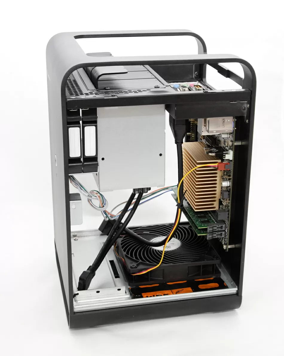 При сборке выяснилось, что автоматическая регулировка скорости вентилятора Asus Q-Fan здесь работает только с 4-контактными PWM-вентиляторами. В корпусе SilverStone CS01-HS установлен вентилятор с 3-контактным Molex-разъемом, и естественно, он постоянно молотит на максимальной скорости в 1250 RPM. В нашем NAS-е все должно быть прекрасно, поэтому вентилятор подлежит замене.