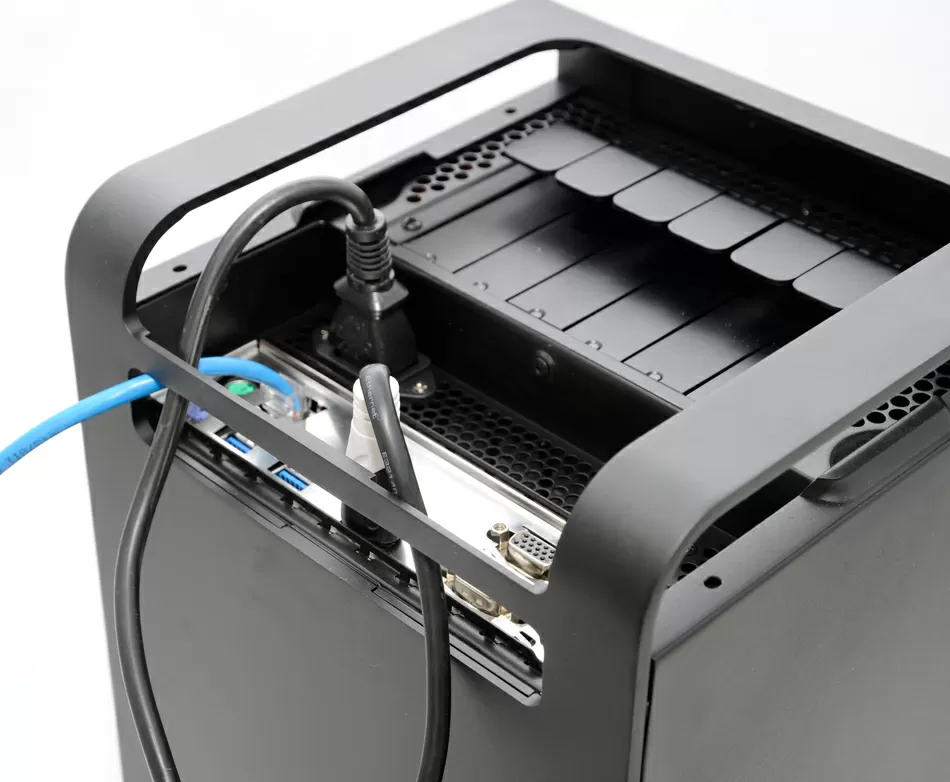 Для установки материнской платы не пришлось вынимать дисковую корзину из корпуса SilverStone CS01-HS. Расстояние от обратной стороны материнки до стенки корпуса составляет около 8 мм, и воздушный поток от вентилятора попадает в этот зазор, обдувая плату с двух сторон.
