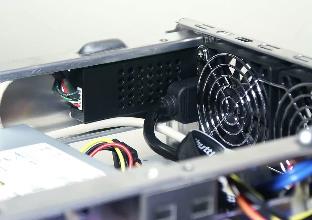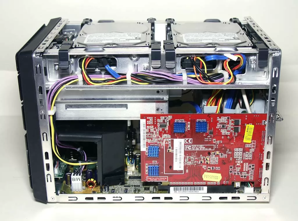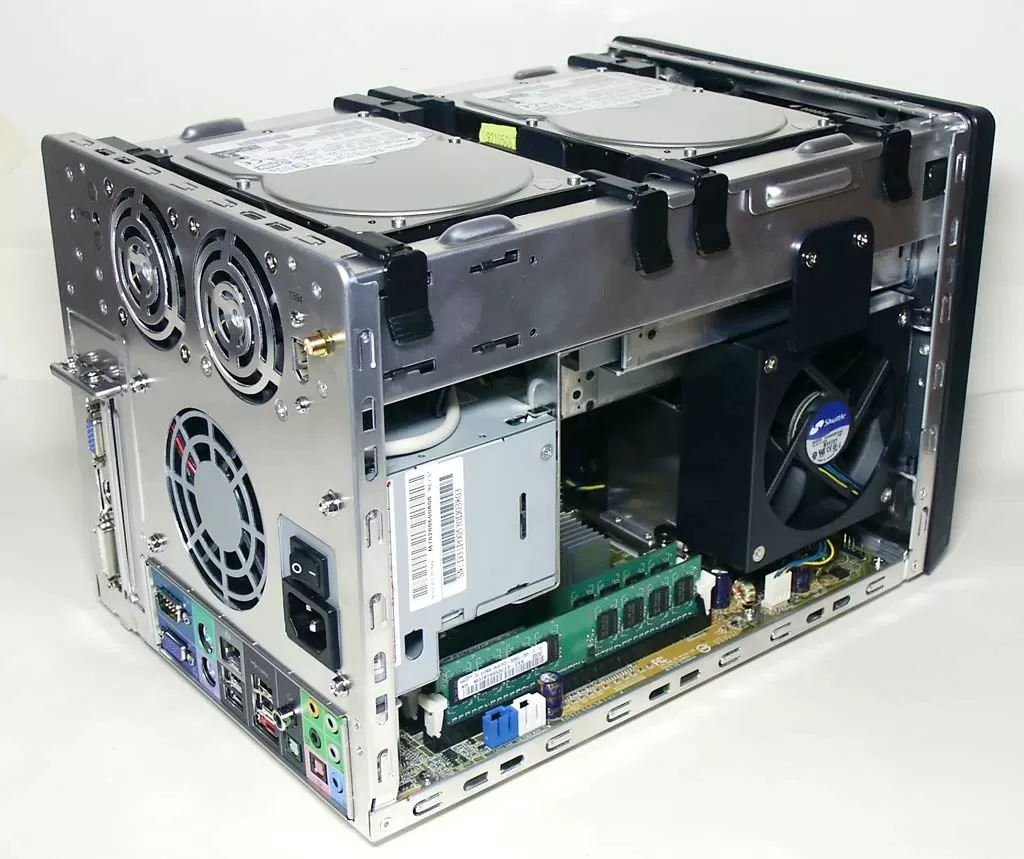 Как вы можете видеть, два жёстких диска установлены в верхней части корпуса, под крышкой. Они охлаждаются двумя вентиляторами на задней стенке корпуса, которые отводят тепло именно от дискового массива. Винчестеры Hitachi объёмом по 250 Гб с частотой вращения шпинделя 7200 оборотов в минуту - не самые холодные из продающихся сегодня, но мы уверены, что шасси Shuttle P-Series не дадут им перегреться. В любом случае, проверим.