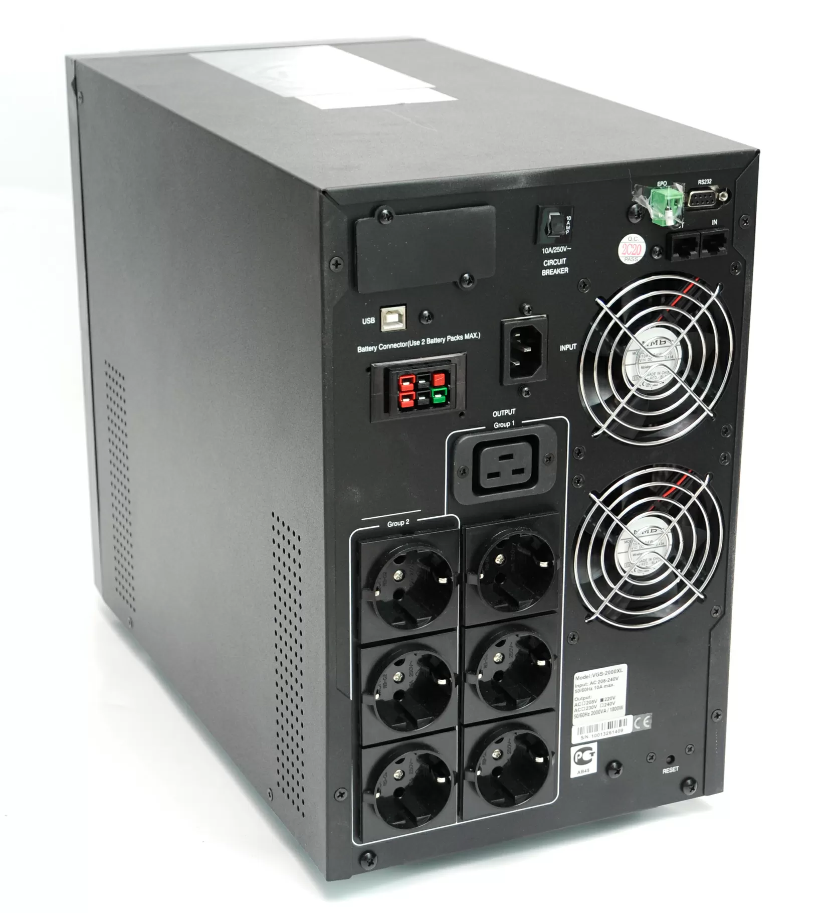 А вот здесь нужно быть осторожным и вспомнить основы безопасности. Дело в том, что розетки IEC320 C19 специально несовместимы с обычными IEC320 C13, которые имеются в блоках питания компьютеров и серверов, чтобы пользователь по глупости не воткнул 3-киловаттную вилку в обычную розетку и не вызвал перегрузку, при которой в лучшем случае выбьет автомат или сработает защита ИБП, а в худшем случае загорится проводка. На входе PCM VGS-2000XL установлен электромагнитный 10-амперный автомат, защищающий от перегрузки, и зачем здесь 15-амперная розетка, остается только гадать.