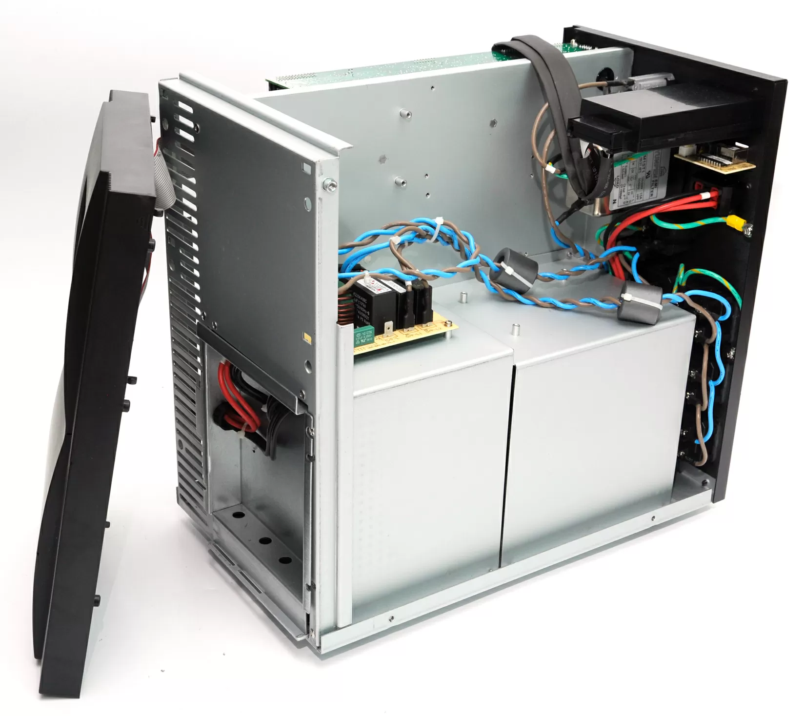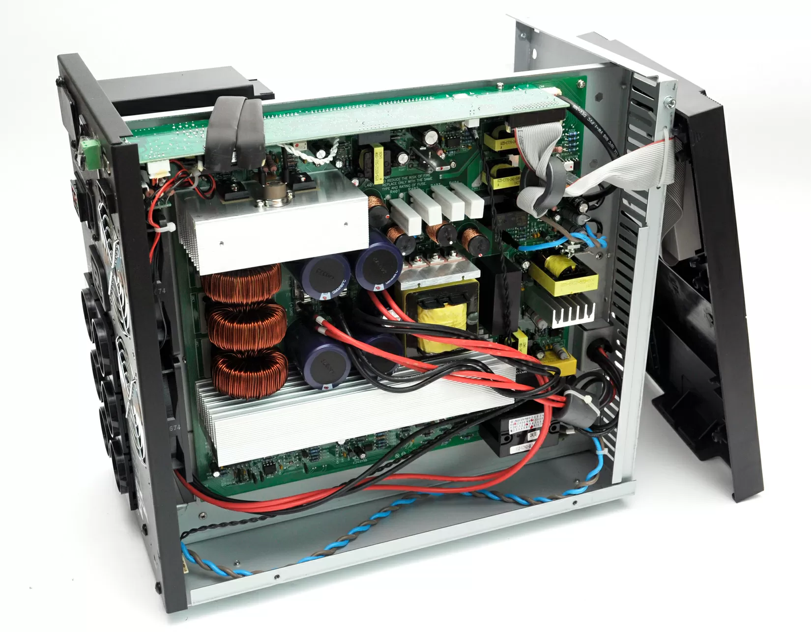 Внутри корпус Vanguard VGS-2000XL разделен на две части: в левой - инвертор, в правой - аккумуляторный отсек. В том же корпусе PCM выпускает старшую модель на 3000 VA, где уже не 6, а 8 батарей, поэтому в нашем случае внутри UPS остается много свободного места.