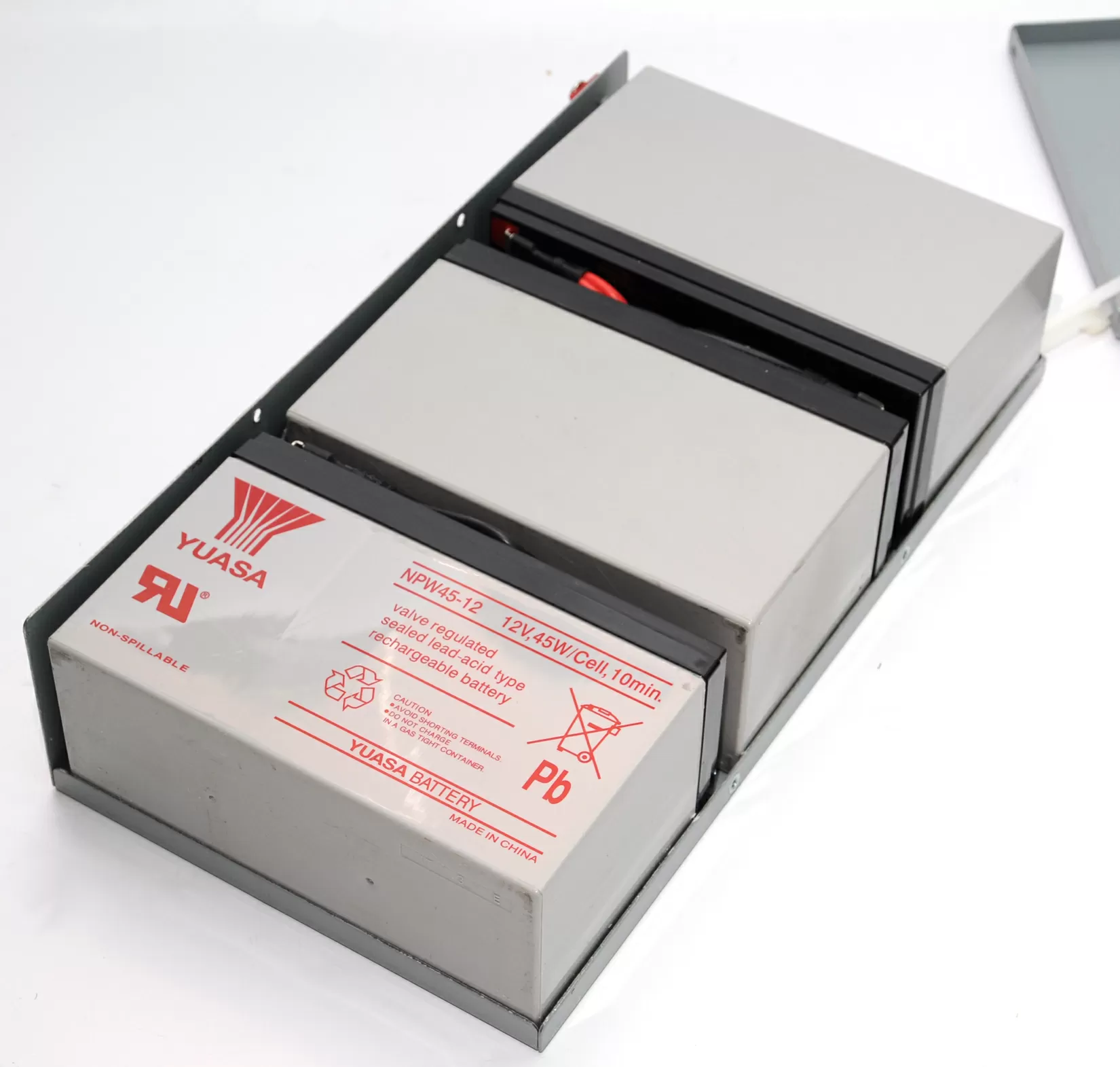Аккумуляторные батареи Yuasa NPW45-12 (VRLA, AGM) по заявлению производителя, имеют срок службы до 5 лет. В PCM Vanguard VGS-2000XL они находятся в двух стальных блоках, скрученных на болтах.