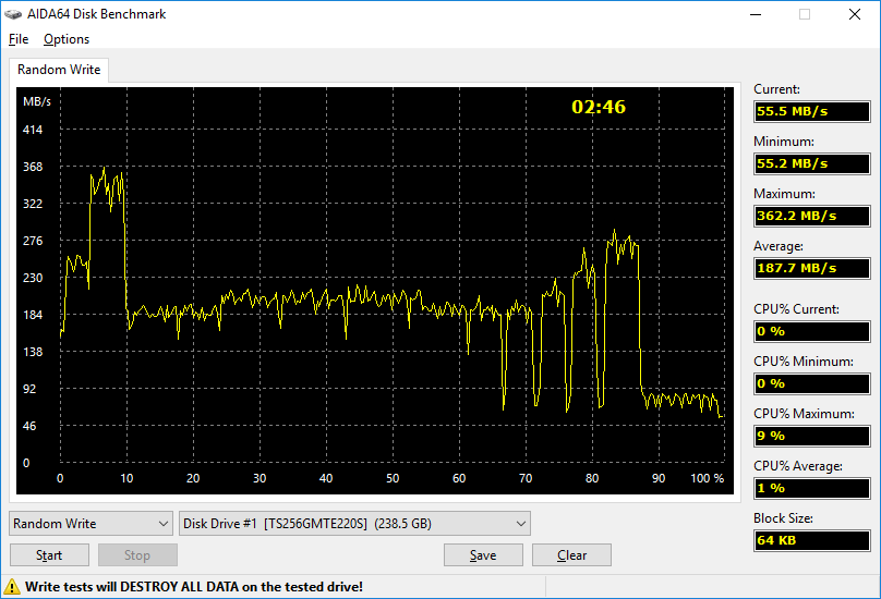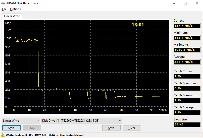 Но на наш взгляд более приближенными к обычному пользователю является тесты AIDA, в которых осуществляется запись и чтение всего объёма накопителя. Так, чтение всего объёма осуществляется со средней скорость 3 ГБ/с, тут вопросов нет. А вот с последовательной записью уже не так радужно, как изначально всем кажется. Вначале буфер (объём которого составляет около 15%, то есть около 36 ГБ) записывается со скоростью около 1 ГБ/с, затем (после заполнения буфера) скорость существенно падает до цифры около 270 МБ/с, а ближе к заполнению диска на 2/3 объёма скорость падает ещё и составляет около 140 МБ/с. Всего на последовательную запись всех 238 ГБайт затрачено 18 минут. Конечно же, эти тесты показывают на что способен накопитель при постоянной записи, а в реальной жизни же операции редко будут выходить за пределы буфера (напомним, это почти 40 ГБ) и пользователь будет видеть цифры порядка 3 ГБ/с на чтение и 1 ГБ/с на запись. Если кто забыл, то у обычных SSD накопителей максимальные цифры составляют около 600 МБ/с, то есть по факту разница с NVMe очень существенная.