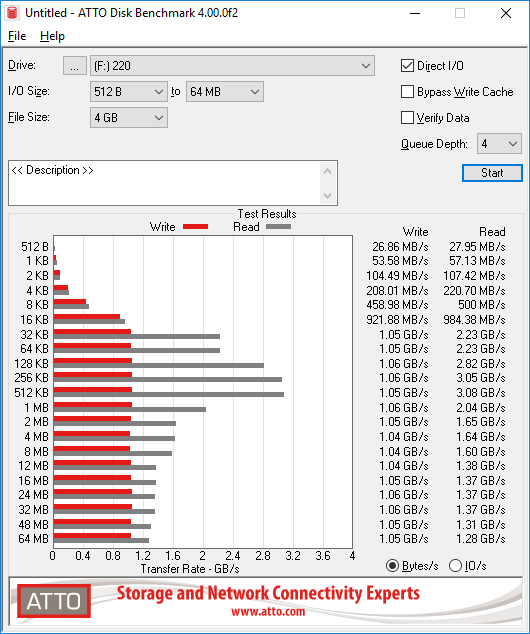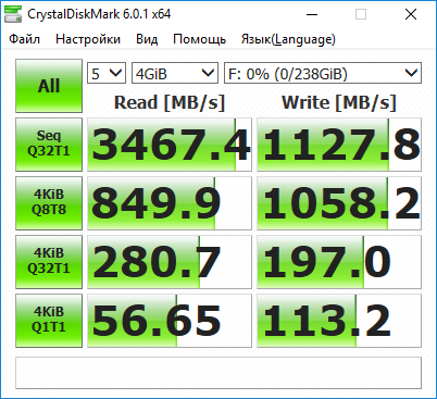 По традиции, вперёд мы пропускаем тесты CrystalDiskMark и ATTO Disk Benchmark, результаты которых сколь наглядны, столь и не раскрывают главной сути. Тем не менее, максимальные цифры действительно близки к обещанным производителем – порядка 3500 МБайт/с на чтение и около 1100 МБайт/с на запись. Цифры в операциях с малыми блоками тоже неплохие, но особенно приятно что (как это принято у твердотельных накопителей) максимальные скорости демонстрируются уже практически на блоках 16-32 Кб.