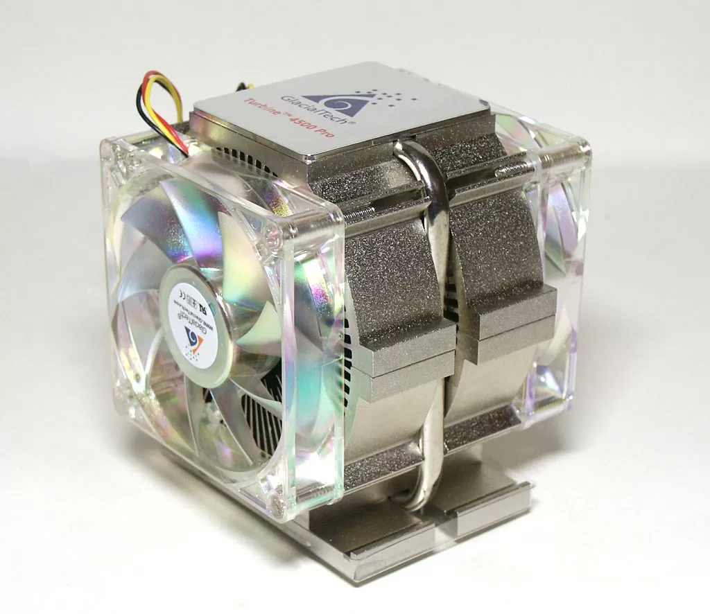 Многие производители пытались использовать эффект турбины, но потерпели фиаско. Дело в том, что заставить работать два вентилятора последовательно труднее, чем если бы они работали параллельно. В данном случае один из них установлен на вдув, а другой - на выдув. И они не должны мешать друг другу, а наоборот - должны помогать переносить воздух сквозь радиатор. Если разместить их слишком близко друг к другу, они будут сбиваться, один начнёт работать быстрее другого и появится противный вой, как у настоящей турбины. Если наоборот - слишком далеко, то не удастся достигнуть желаемого эффекта. Кстати, два устройства, включенные последовательно, снижают в два раза надёжность общей системы. И действительно, если здесь один из вентиляторов выйдет из строя, то второй должен будет не только перегонять воздух через радиатор, но и преодолевать сопротивление лопастей первого. Проще говоря, один электромоторчик будет крутить лопасти двух вентиляторов. Эффективность охлаждения от этого сильно пострадает. Поэтому GlacialTech использует вентиляторы с шарикоподшипниками.