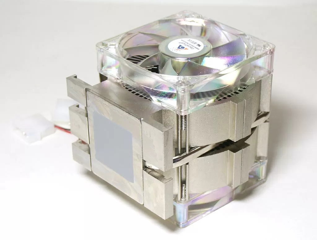 Это чем-то похоже на автоклав, чем-то на стиральную машину, но на самом деле это грамотно просчитанный радиатор, составленный из двух частей, произведённых по методу выдавливания. Как видно, радиатор имеет большую плотность рёбер разной длины, каждое из которых имеет форму конуса. Посередине, в "мёртвой точке" вентиляторов остаётся пространство для воздушного потока.
