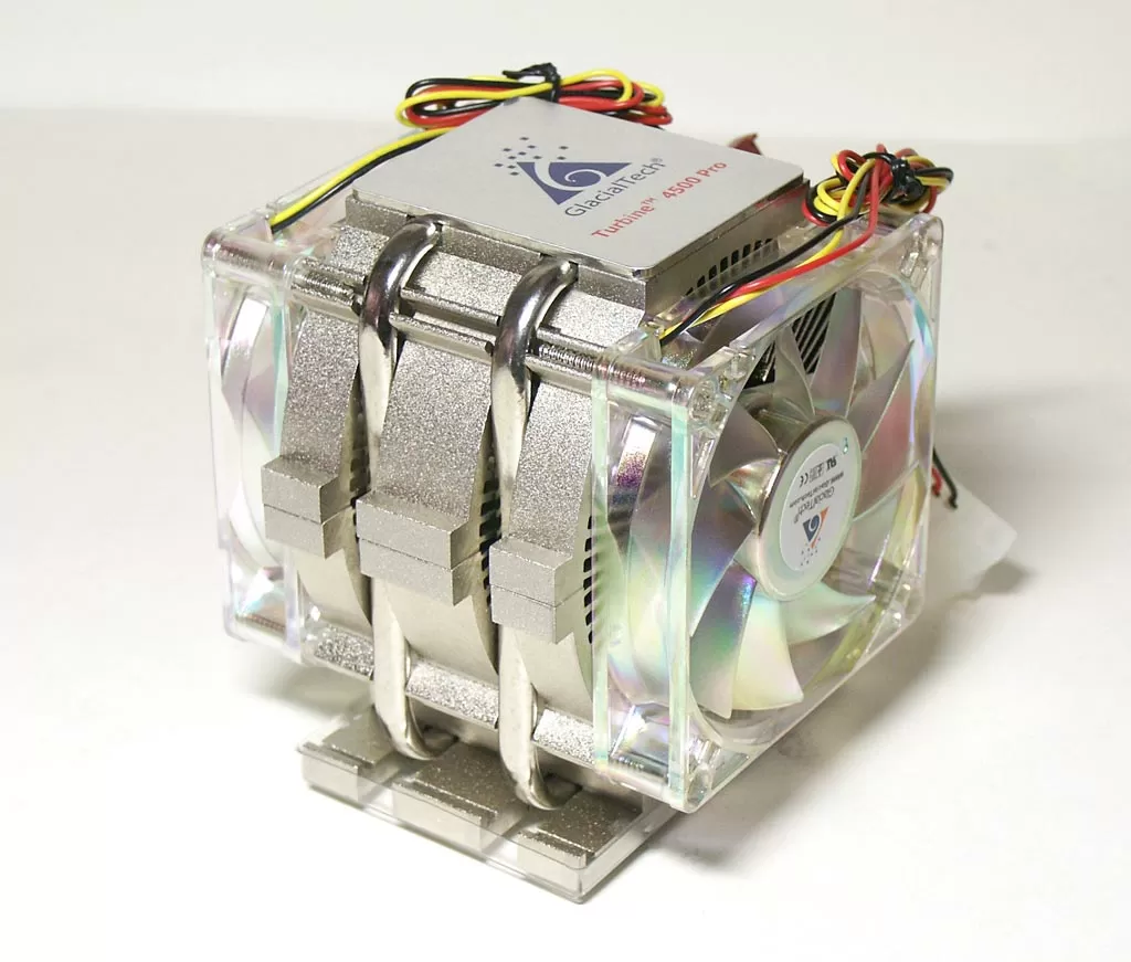 Меня всегда удивляло, как компании GlacialTech удавалось создавать простые по конструкции, но в то же время весьма эффективные кулеры для процессоров. Секрет производительности был в высоком качестве используемых радиаторов и вентиляторов, что во многом и определяло дороговизну кулеров серии Igloo. Но время и технический прогресс заставляют производителей кулеров искать новые конструктивные решения, как правило, с использованием теплопроводящих трубок (heatpipe). В конце 2004 года компания GlacialTech выпустила на рынок совершенно новые модели охладителей для процессоров. Кулеры серии Turbine 4500 никак не вписывались в общие черты модельного ряда GlacialTech. Компания впервые отступила от канонов и на смену классической конструкции пришла новая, доселе невиданная. И благодаря этому GlacialTech Turbine 4500 обещает высокую производительность при низком уровне шума. В этом обзоре мы проверим, насколько хороша в действии конструкция кулеров Turbine 4500 и так ли велика турбическая сила GlacialTech? Посмотрите на фотографию, чтобы понять, с чем мы тут имеем дело.