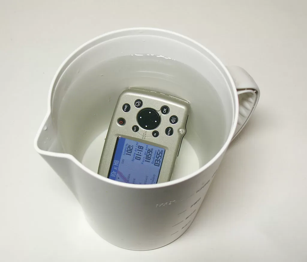 Корпус GPS-навигатора сделан водонепроницаемым. Компания Garmin утверждает, что Quest может находиться под водой на глубине в 1 метр до 30 минут. Мы решили незамедлительно проверить водонепроницаемость устройства и кинули его включённым в чайник с водой.
