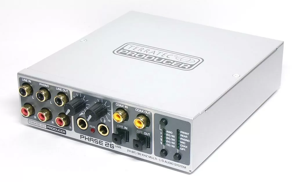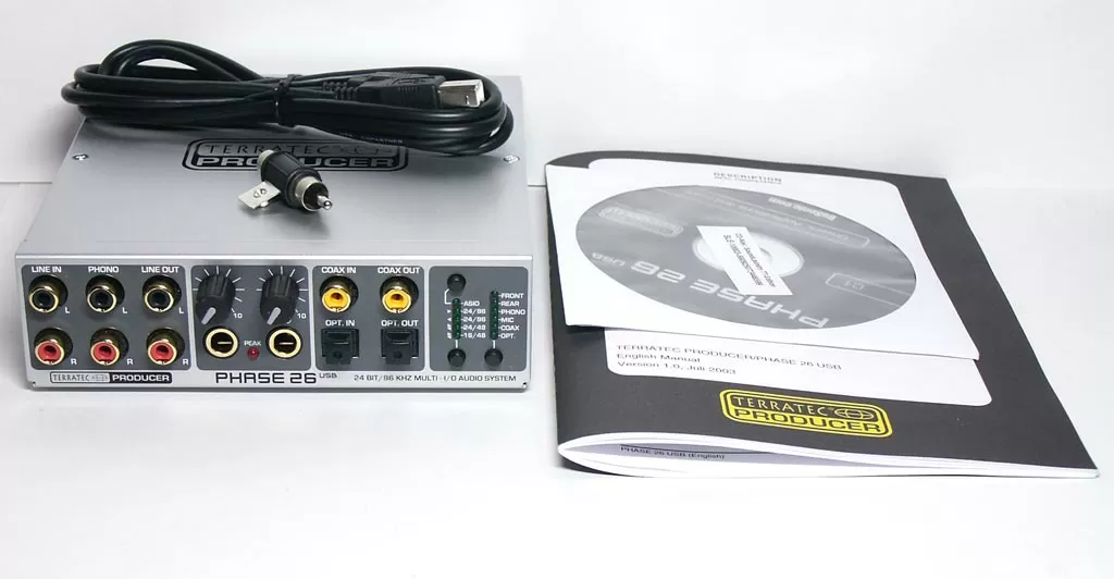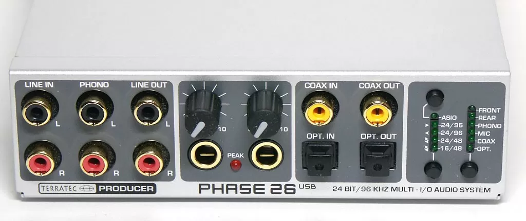 Внешне данный блок поразительно напоминает внешний блок от звуковой карты Terratec DMX6 Fire. С той лишь разницей, что здесь на лицевой панели вместо двух MIDI-портов установлены светодиодные индикаторы и кнопки, переключающие режим работы аудиоинтерфейса. На лицевой панели расположены три пары аналоговых контактов "тюльпанчиков" линейного входа, "phono" для подключения магнитофона или проигрывателя виниловых пластинок и линейного выхода. Справа от них - два гнезда наушников и микрофона с регуляторами уровня. Ещё правее - цифровые входы и выходы: коаксиальные и оптические. И с краю справа располагаются три кнопочки переключения режима работы и два столбика со светодиодными индикаторами режима работы Phase 26 USB.
