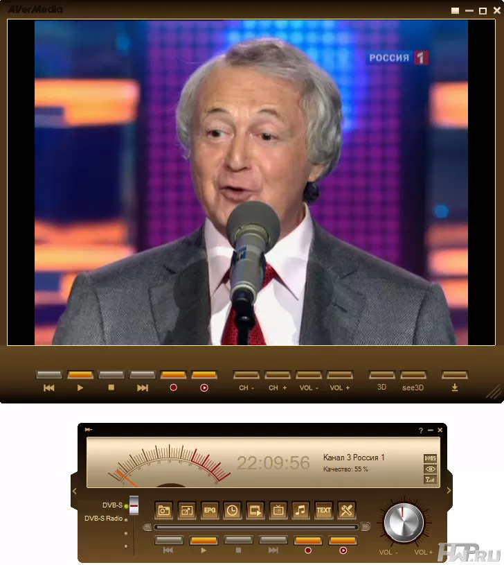 Но так как 3D хочется уже сегодня, а каналов считай, что и нет, то нажимая кнопку «See3D», можно включить модуль, преобразующий картинку 2D в 3D. Используется алгоритм смешивания текущего и предыдущего кадров. Мы уже встречали такое преобразование в ТВ-тюнерах Beholder, и убедились, что качество преобразования сильно зависит от визуального ряда первоисточника, и лучше всего проявляется в спортивных трансляциях и советских кинофильмах. Алгоритм простой и не грузит ресурсы компьютера. Правда, на данный момент эта функция реализована в ТВ-тюнере Aver3D SatelliteTV только в полноэкранном режиме просмотра и вы не можете переключать каналы при просмотре ТВ в режиме «псевдо3D».