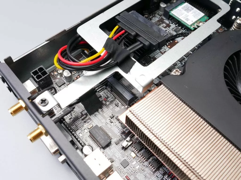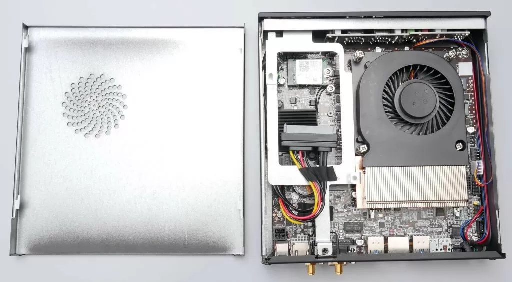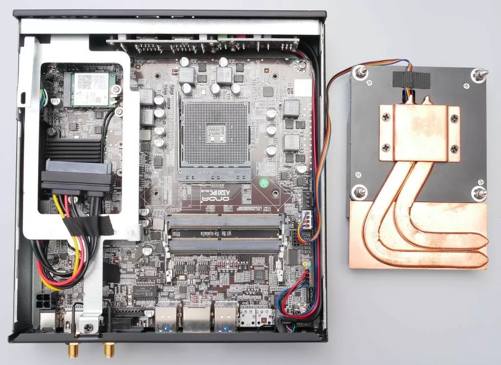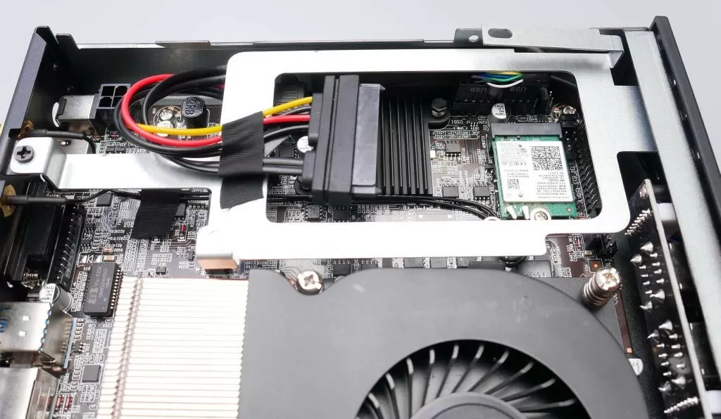 Идём дальше. Рядом с кулером размещается пространство для установки накопителей. На съёмной металлической планке можно зафиксировать 2,5” SATA 3 накопитель (HDD/SSD), а под ней находится посадочное место для M.2 2242/2260/2280 диска, причём поддерживаются и NVMe накопители.