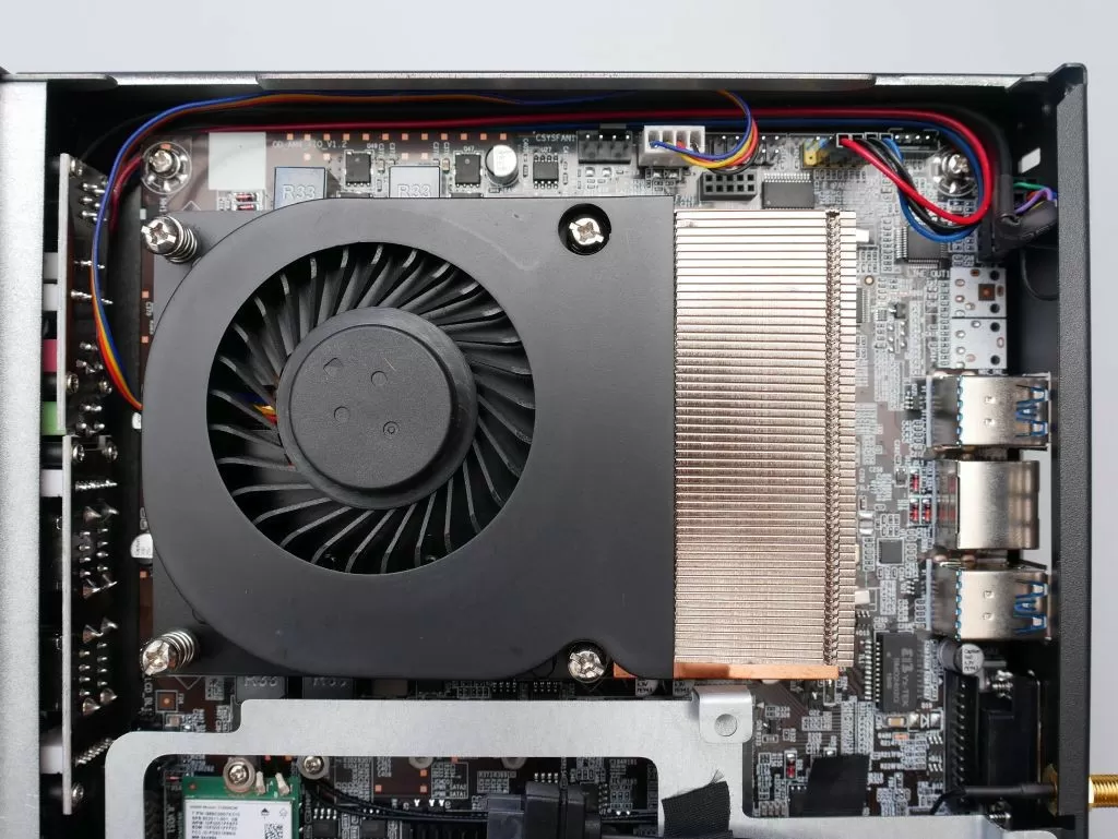 Снимаем верхнюю крышку и заглядываем внутрь. Устройство внутреннего мира в меру компактное, но много чему нашлось место. Начнём с процессорного кулера – это плоская турбина с небольшим радиатором, который соединён с подошвой посредством двух тепловых трубок. Для удобства установки кулера в комплекте идёт термоинтерфейс, который легко нанести на процессор. Но больше любопытно другое – под радиатором процессора располагаются два слота для оперативной памяти SO-DIMM DDR4. То есть для установки/замены модулей придётся снимать кулер – не очень удобно, но как есть.