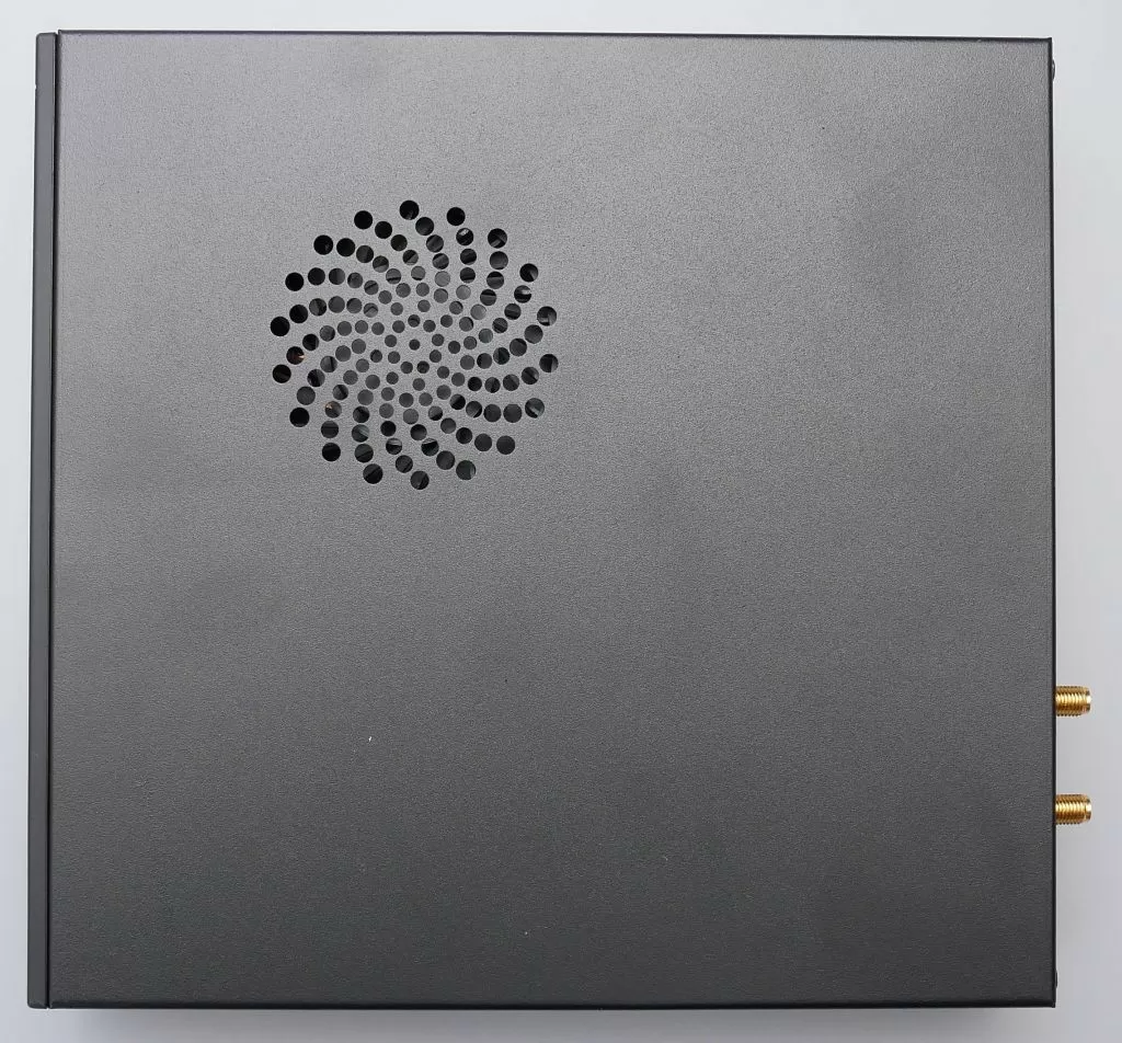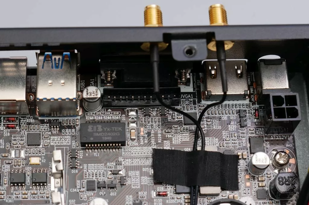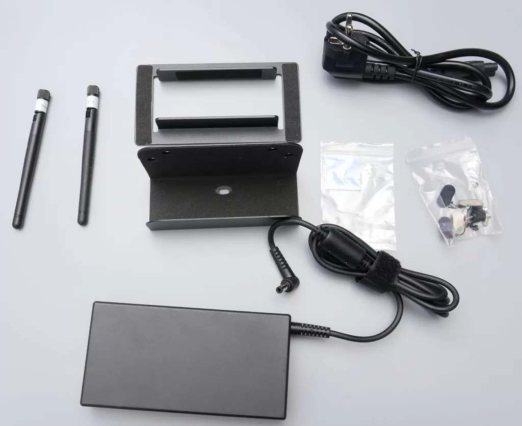 Сразу скажем, что нам на тест достался пред серийный образец, который отличается от серийного отсутствием COM-порта. Возможно, что наш вариант отличается и упаковкой – к нам баребон пришёл в простой картонной коробке без какого-либо оформления. Внутри коробки очень плотно разместились: сам миниПК, два крепления (вертикальное и VESA 100x100), внешний блок питания мощностью 120 Вт, сетевой кабель, две компактные Wi-Fi антенны, комплект крепежа и резиновых ножек, и одна термопрокладка для быстрой установки кулера на процессор (чтобы не пользоваться термопастой).