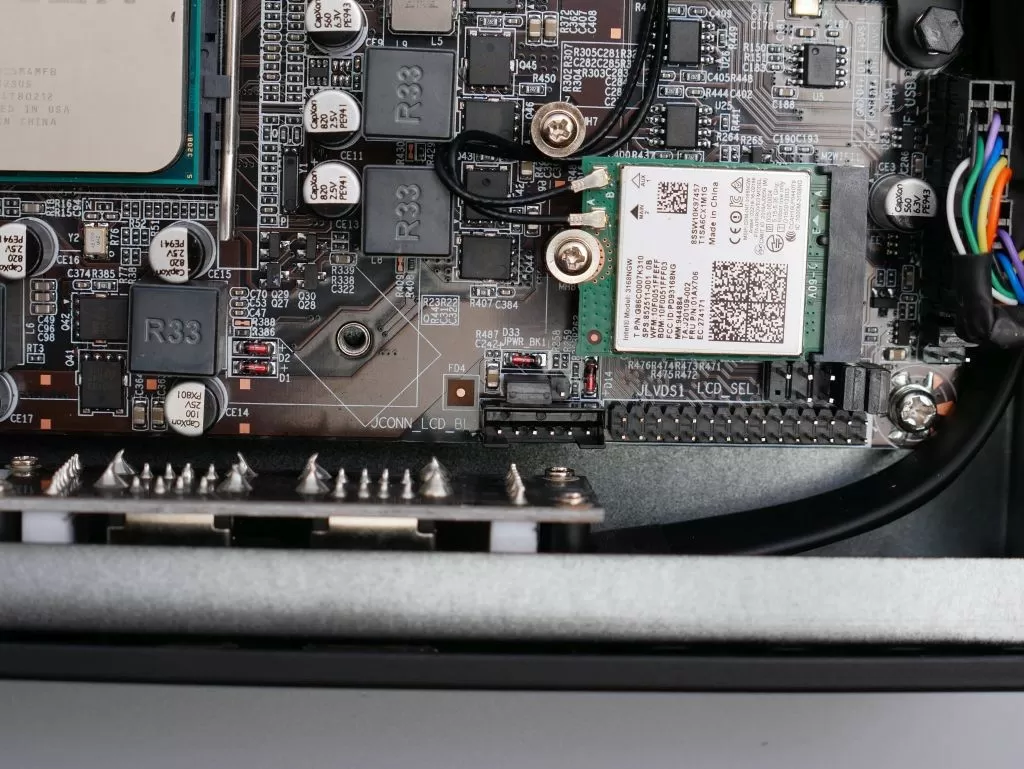 Ну и пара интересных мелочей. На материнской плате уже установлен Wi-Fi модуль Intel 3165NGW (802.11ac, 2,4/5 ГГц, максимальная скорость 433 Мбит/с, встроенный Bluetooth 4.2), также имеется разъём для вывода ещё двух USB 2.0 портов, 4pin разъём для подключения второго вентилятора, разъём («гребёнка») VGA и разъёмы для подключения LCD дисплея (в их числе - LVDS 30pin). Вполне возможно, что на базе данной системы может быть создан POS-терминал.