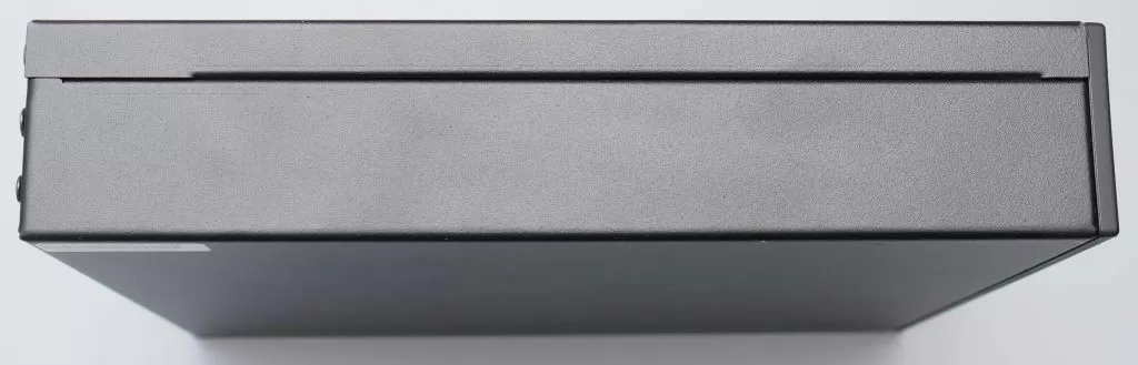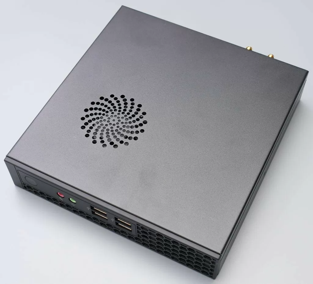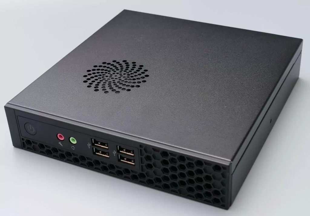 Взглянем на сам неттоп. Он имеет габариты 190х180х40 мм, корпус выполнен из металла, если не считать пластиковой фронтальной панели. Да, дизайн минималистичный, неброский, зато очень радует большое количество USB портов спереди – аж 4 штуки. Правда, стандарта USB 2.0. Также есть пара стандартных аудиопортов и кнопка включения. Также на передней панели заметна перфорация для забора воздуха.