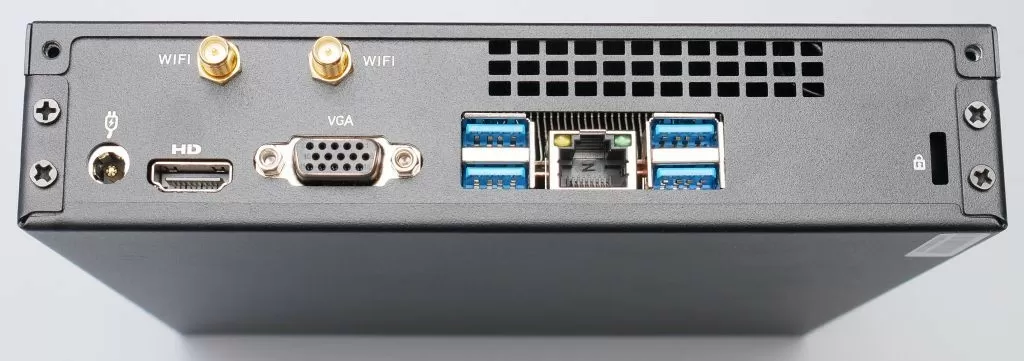 Хотя основной забор воздуха осуществляется через перфорацию на верхней съёмной крышке аккурат над процессорным кулером. Но перед разборкой нужно посмотреть на заднюю часть корпуса. Тут находятся ещё четыре порта USB, на этот раз стандарта 3.0 (итого – восемь портов USB), видеовыходы HDMI и VGA, два Wi-Fi коннектора, сетевой коннектор LAN RJ45, разъём для подключения внешнего блока питания, а также отверстие для замка Kensington.