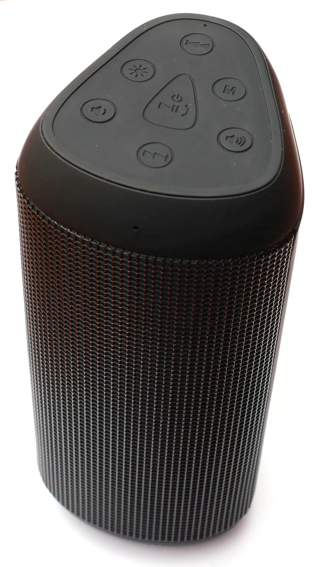 С чем определяешься сразу – так это с передом. Перед там, где находится металлическая решётка. За ней прячется подсветка, динамик (и, предположительно, пассивный излучатель). На одном торце корпуса находятся кнопки управления (включение, регулировка громкости, переключение режимов работы, треков, управление подсветкой). На другом торце находится модуль NFC для быстрого и лёгкого подключения колонки к смартфону/планшету.