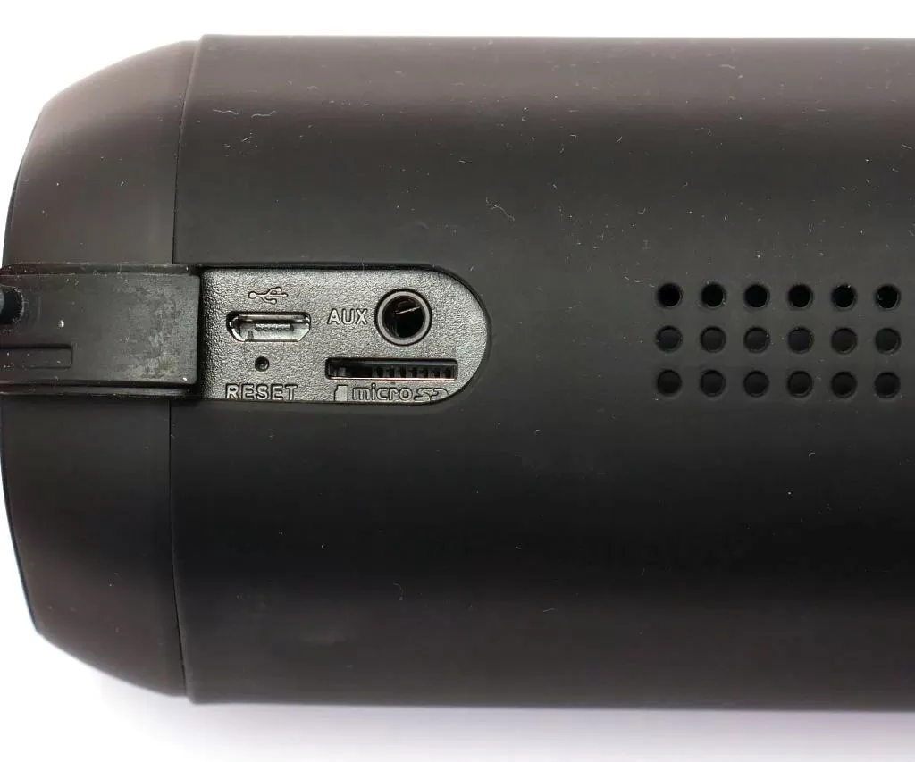 Сзади, за маленькой резиновой заглушкой находится порт microUSB для зарядки, AUX аудиовход (3,5 мм, кабель идёт в комплекте), а также слот для карточек формата microSD.