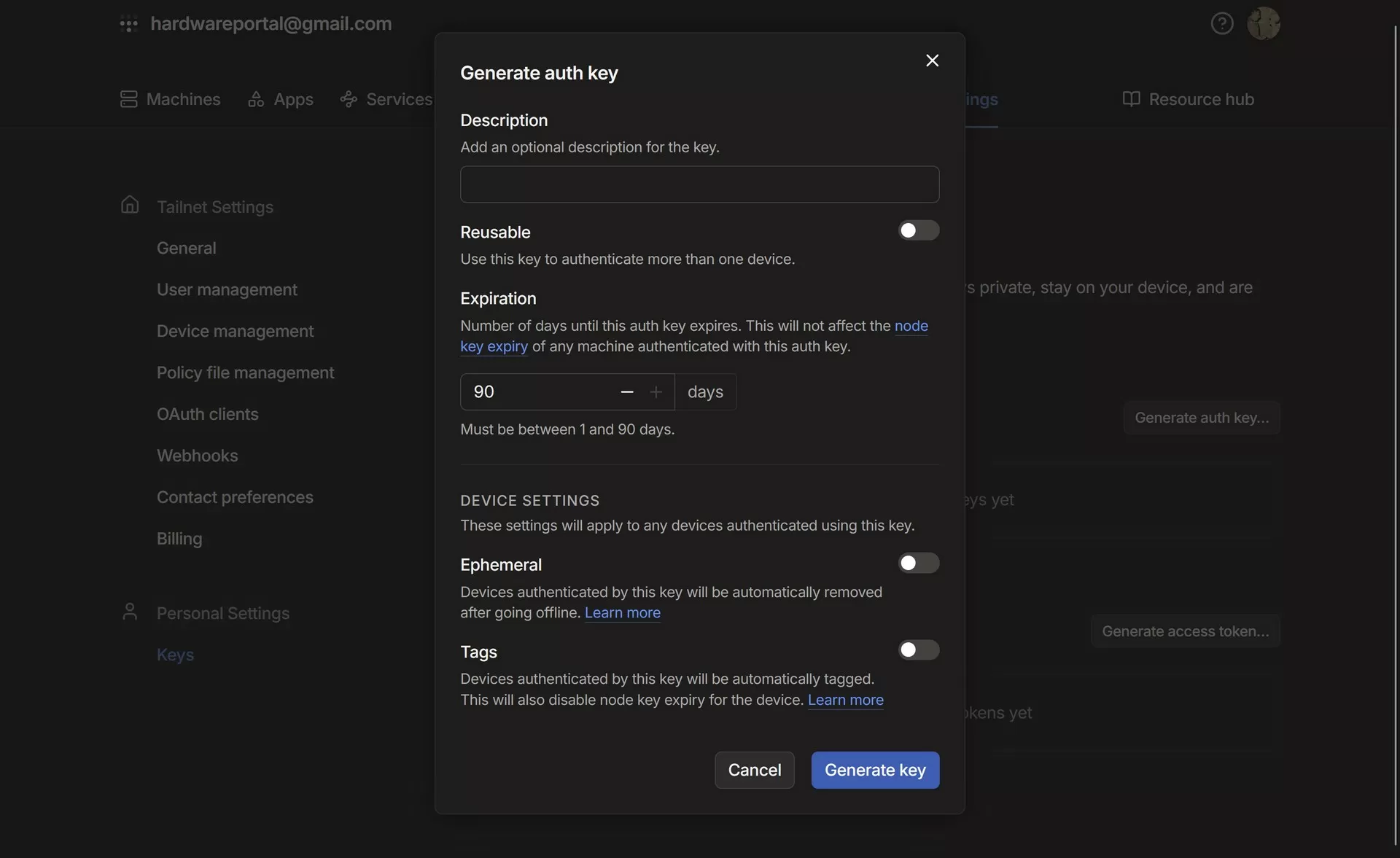 Для интеграции Tailscale с шлюзом Zyxel необходимо получить Auth Key (токен авторизации). Он создаётся в панели управления Tailscale: Admin Console → Settings → Keys → Generate Key. Этот ключ используется при активации клиента на стороне Zyxel USG Flex 500H, где создаётся постоянное соединение с Tailscale‑сетью и обеспечивается доступ устройств по внутренним адресам. Интересно, что Zyxel USG Flex 500H поддерживает только 1 аккаунт Tailscale, но в отличии от традиционных VPN сетей, этого достаточно для гибкой настройки.