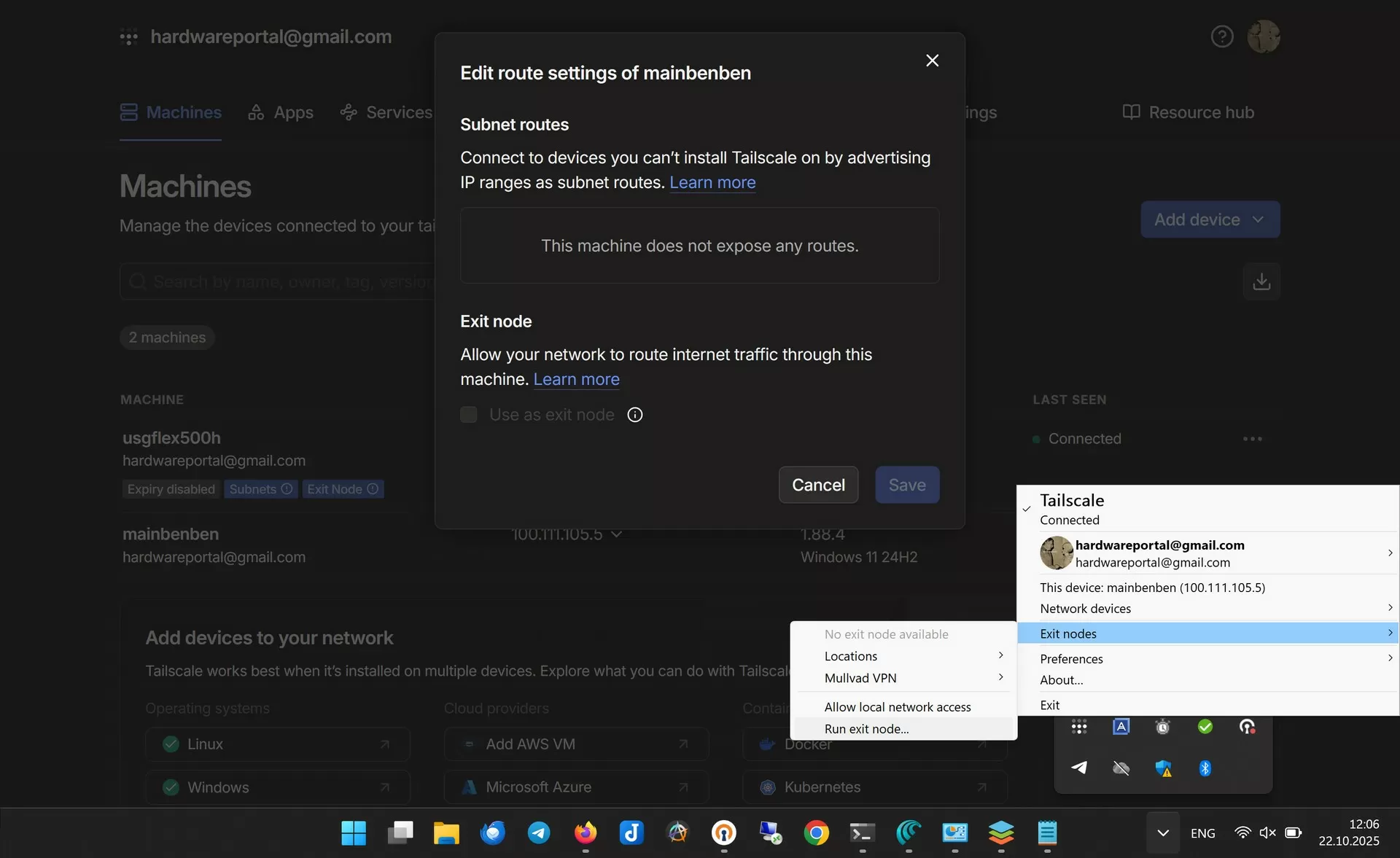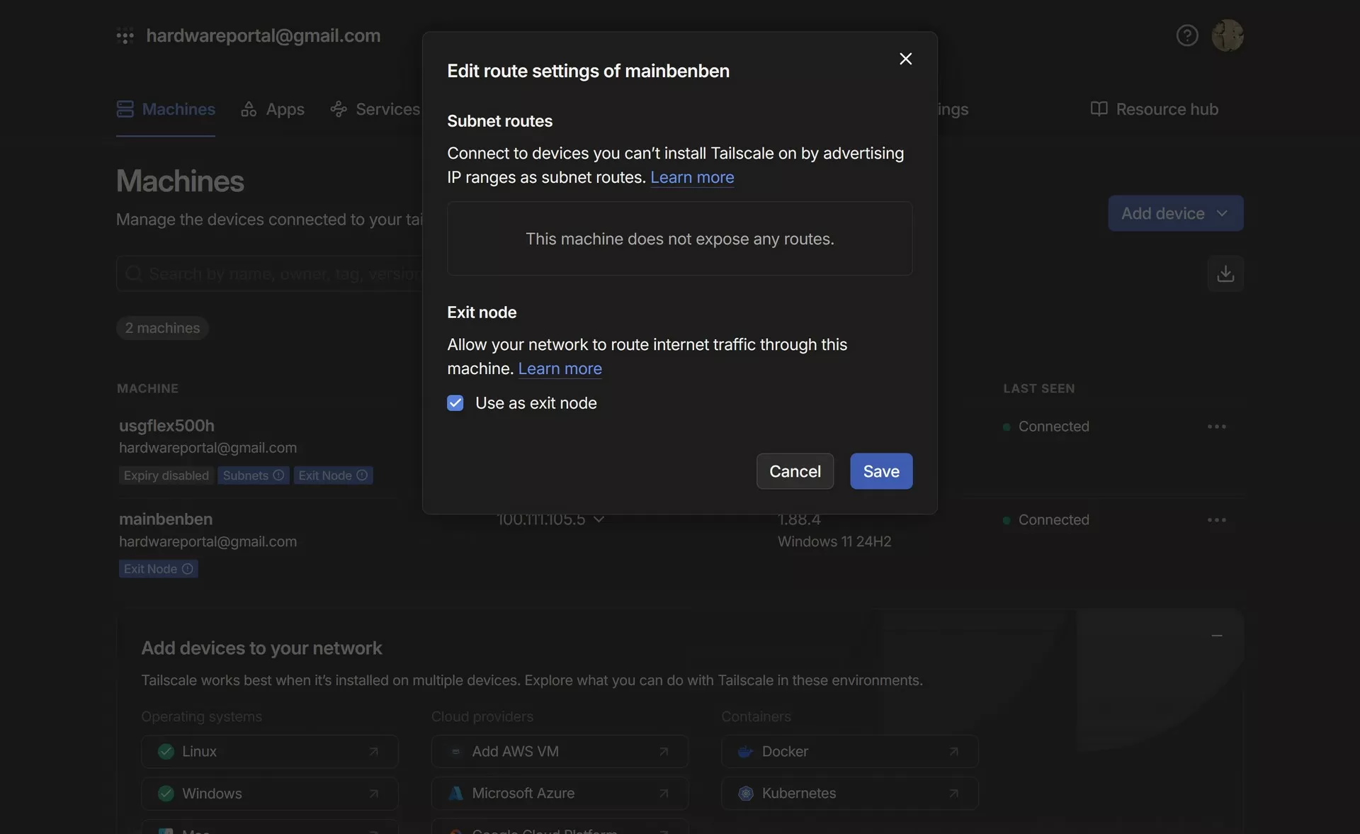 После активации нужно разрешить использование узла как Exit Node в админ‑панели Tailscale.