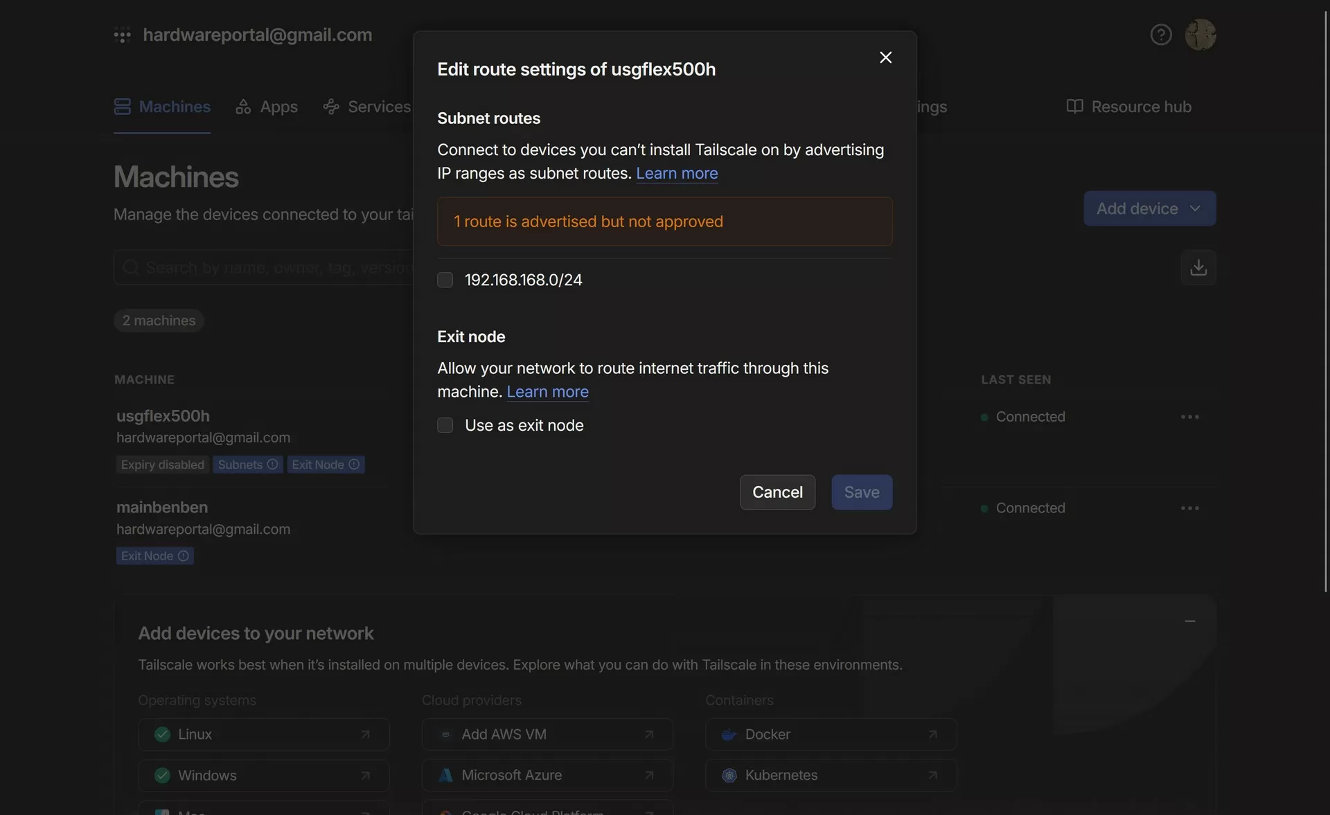 После активации этих маршрутов в панели Tailscale администратор подтверждает доступ пользователей к анонсируемым подсетям.