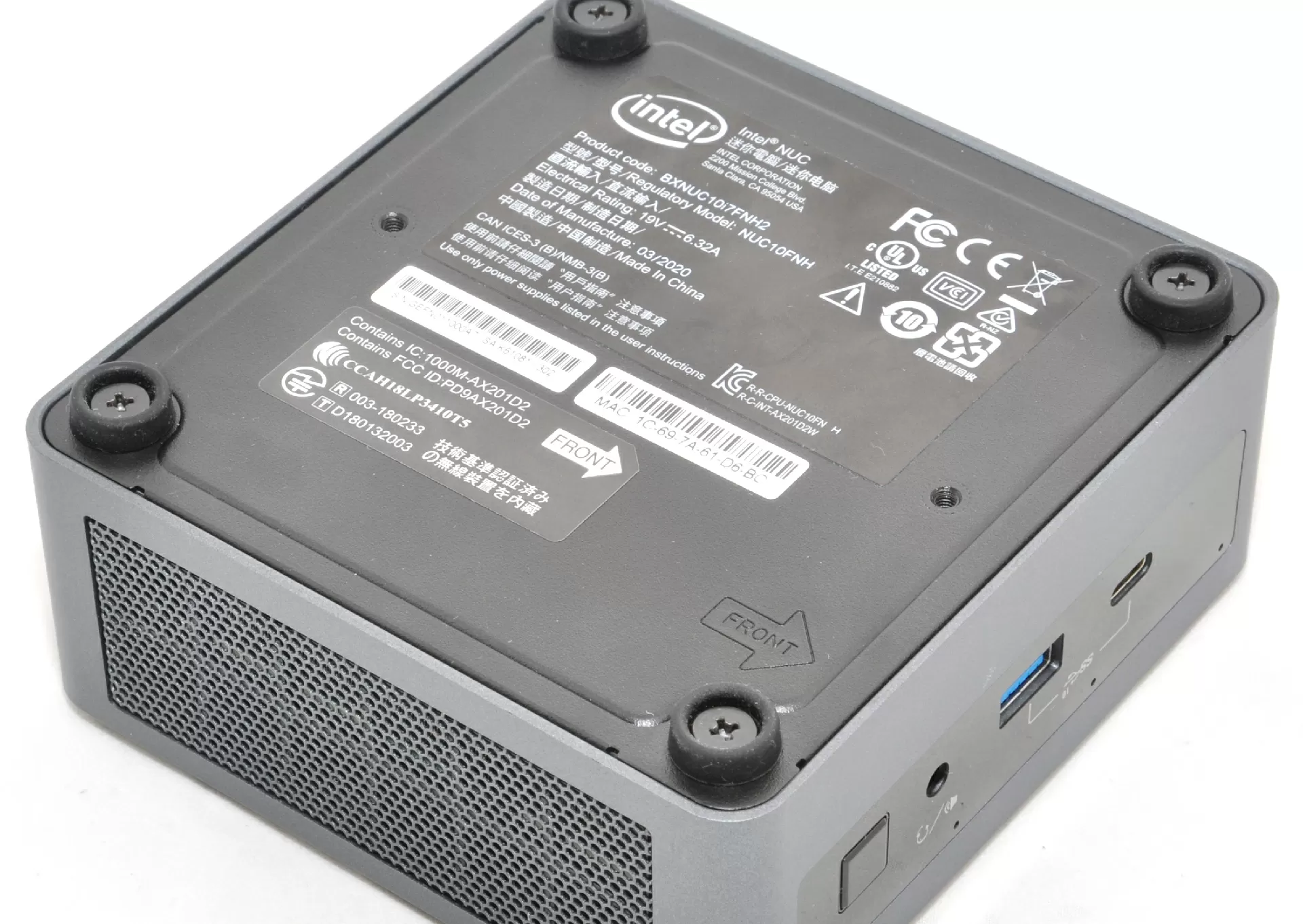Что касается аудиотракта, то Intel NUC10i7FNH имеет комбинированное аналоговое гнездо для гарнитуры (стерео + микрофон) на лицевой панели, а многоканальный звук в конфигурации 7.1 выводится через HDMI в цифровом виде. Помимо HDMI, для подключения монитора может использоваться и Thunderbolt-3.