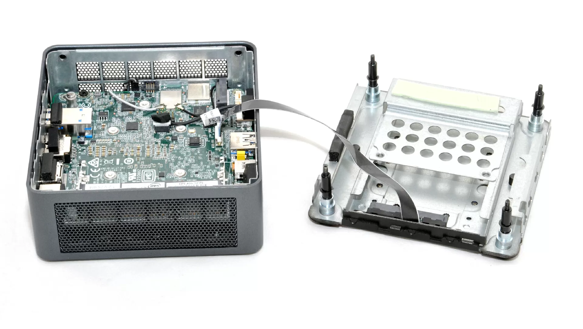 Интересно, что конструкция крышки корпуса Intel NUC такова, что на неё отводится тепло от M.2 диска через толстую теплопроводящую подушку.