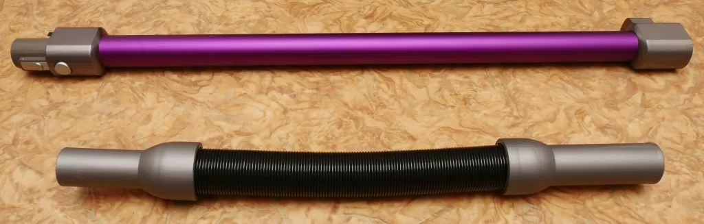 Более половины комплектации занимают различные щётки и трубки. Трубок – две штуки. Она жесткая с контактами для питания турбощетки, вторая гибкая – как гофра, но без контактов. Также в комплекте есть переходник - гнущееся колено, с его помощью можно подцепить насадку под углом. Теперь о щётках – их ах пять штук. Две ключевые – с турбощётками, одна побольше для обычной уборки, вторая – компактная. И ещё три простые щётки (пара из них – с выдвижной щетиной) для различных сценариев уборки – для уборки диванов, узких мест и т.п.
