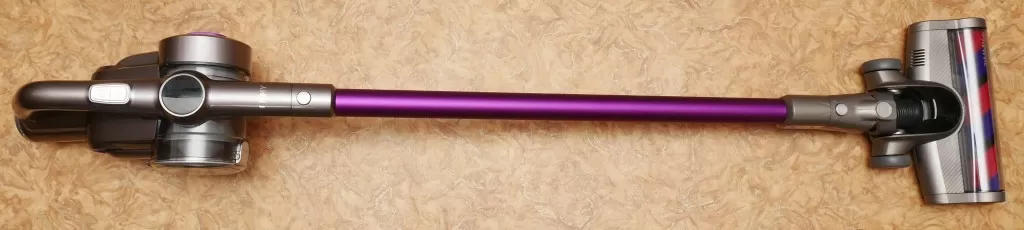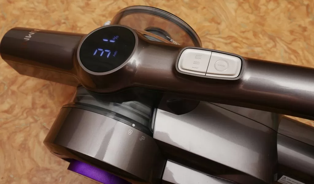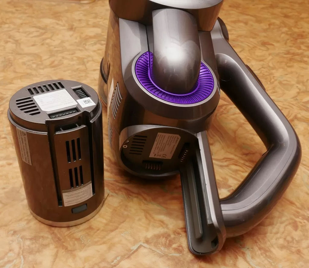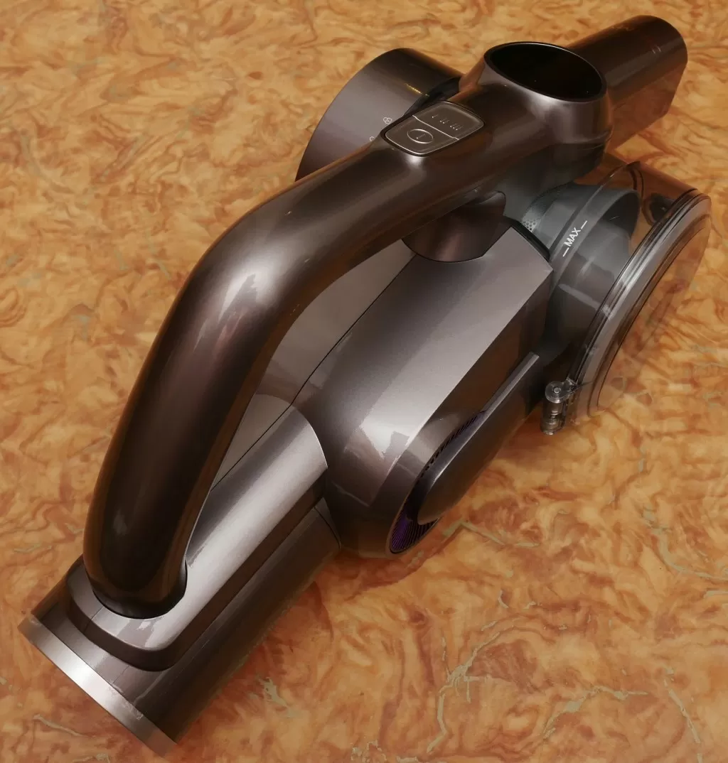 Теперь посмотрим на сам пылесос. Спору нет – смотрится футуристично и крайне интересно. Из интересного – две кнопки управления (включение и регулировка мощности), дисплей, на котором отображается оставшийся заряд аккумулятора, который, к слову, вставляется в ручку, как у большинства аккумуляторных инструментов.