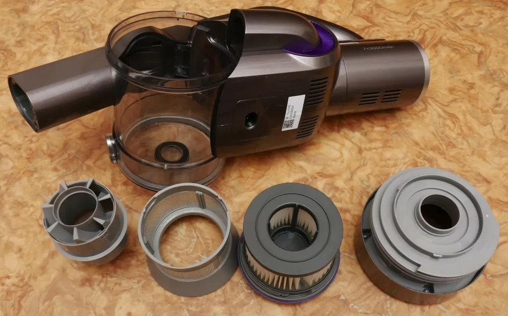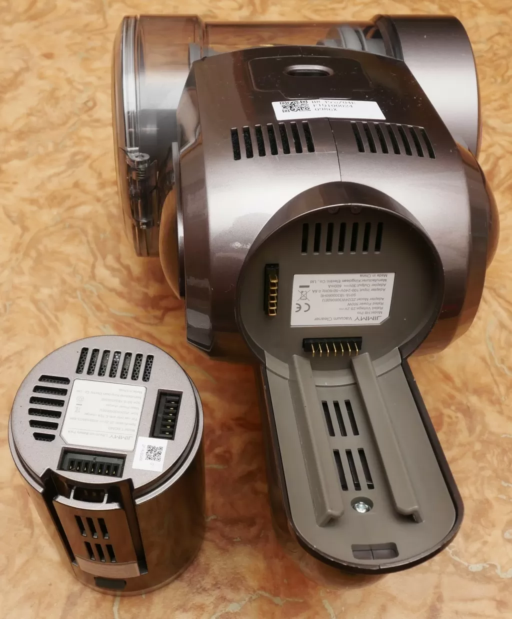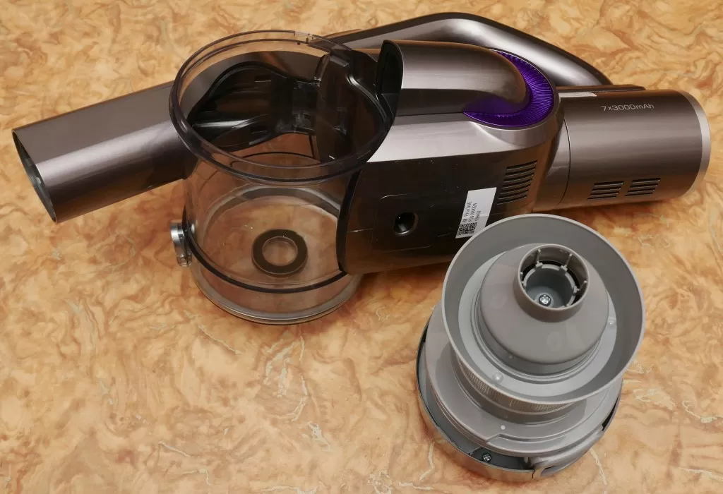 Но самое интересное – это разборка пылесоса. На одном боку находится крышка пылесборника, которая открывается в одно мгновение по нажатию на кнопку, при этом крышка подпружинена. Процедура опустошения контейнера занимает две секунды. На другом боку находится крышка фильтров – конструкция разборная, и за 10 секунд мы получаем доступ и к бумажному и к сетчатому фильтру. То есть замена расходников тоже займёт считанные секунды. Честное слово, JIMMY H8 Pro ловчее любого полноформатного пылесоса. О сравнении с прямыми конкурентами поговорим чуть позже.