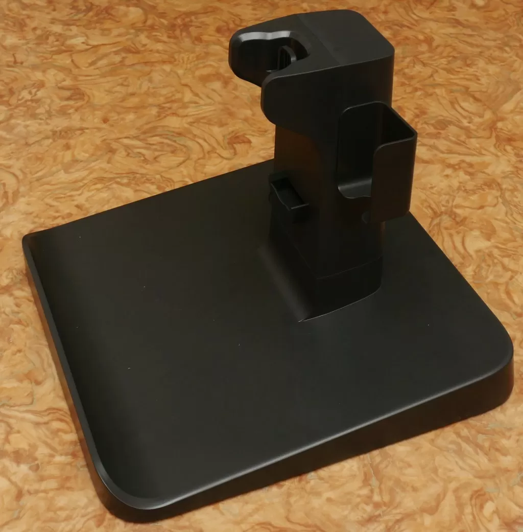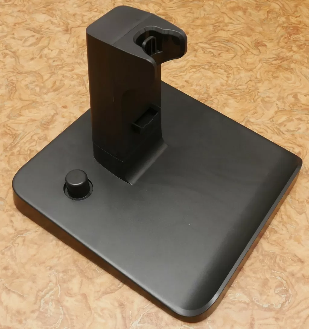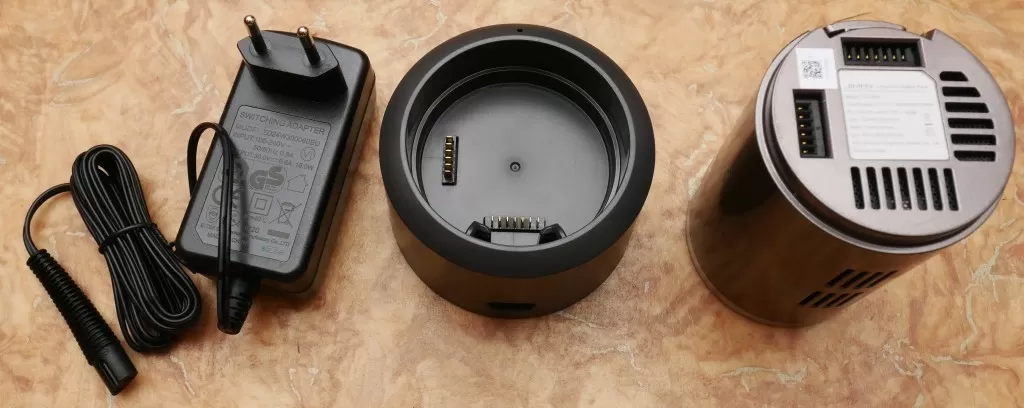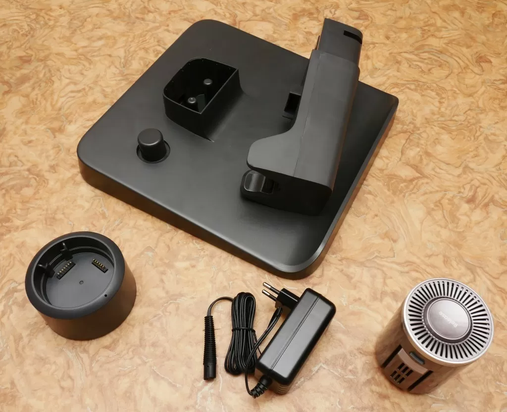 Комплектация очень богатая, даже не знаем с чего начать. В комплекте идёт руководство пользователя на нескольких языках, включая русский, но как обычно я в него загляну только если что-то будет непонятно. Давайте начнём с аксессуаров, а именно с подставки, зарядки и аккумулятора. Да, аккумулятор – съёмный, это плюс, потому что можно купить второй и увеличить время работы вдвое. Причём уже в комплекте идёт док-станция, чтобы аккумулятор можно было заряжать отдельно. Подставка же интересна тем, что, во-первых, подобные пылесосы в принципе крайне редко комплектуются подобным полноценными подставками – обычно это настенное крепление, которое требует сверление (в лучшем случае оно будет фиксироваться на мощный скотч, для которого нужно будет найти ровную поверхность). И, во-вторых. У неё есть специальный маленький кармашек для хранения сетевого зарядного устройства – чтобы его было невозможно потерять.
