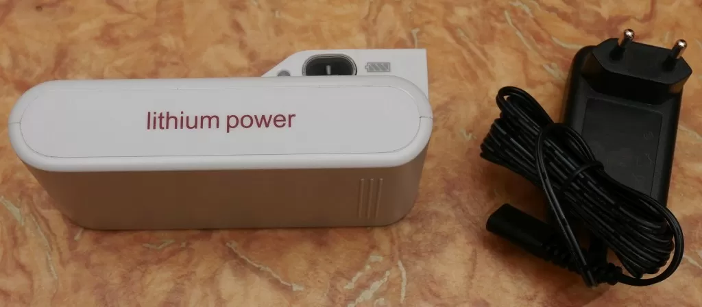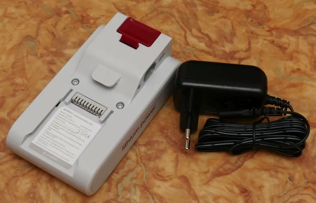 Аккумулятор – также съёмный, но теперь он напоминает таковой от аккумуляторного инструмента. Обращаем внимание что гнездо для подключения сетевого зарядного устройства открыто даже когда АКБ вставлен в пылесос. То есть заряжать его можно и отдельно от пылесоса, и когда АКБ установлен.