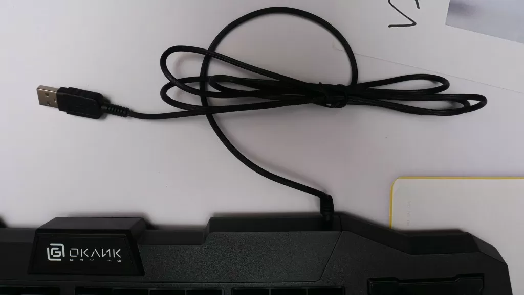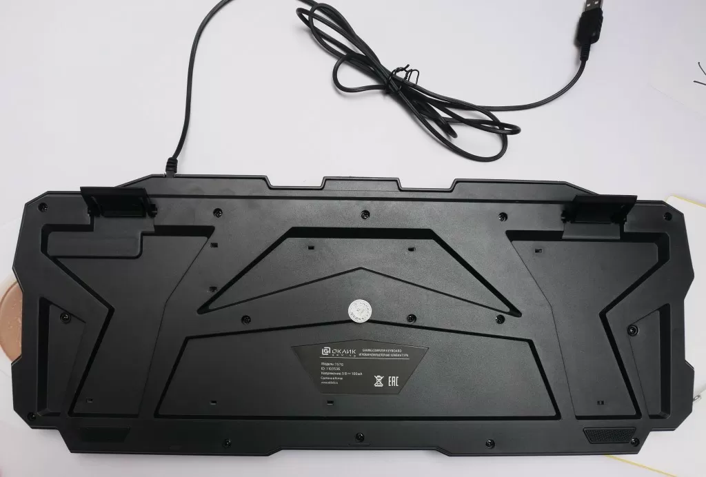 USB кабель – обычный, резиновый, без тканевой оплётки. Снизу есть выдвижные пластиковые ножки и фиксированные резиновые. Также снизу видны отверстия для слива воды, а значит если случайно пролить на ОКЛИК 757G MADNESS жидкость – её можно будет аккуратно слить, не повредив клавиатуру.