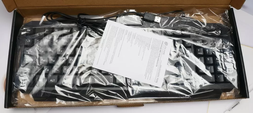 Клавиатура поставляется в картонной коробке обычных размеров. Комплектация ожидаемо отсутствует, если не считать обязательную макулатуру.