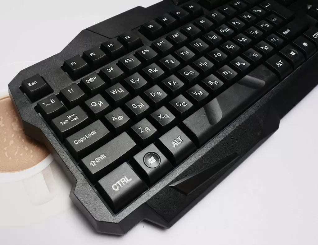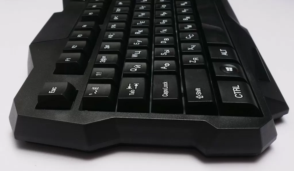 Клавиатура имеет полноразмерную раскладку (104 клавиши) и достаточно крупные габариты – 460х185х30 мм. Корпус конечно же выполнен из пластика, тут никаких откровений, но лёгкой клавиатуру не назвать – весит она без малого 600 грамм. А вот что сразу бросается в глаза – форма некоторых клавиш, например, блока стрелок. А на пробеле заметны две выемки под большие пальцы. Остальные клавиши – практически без изменений.