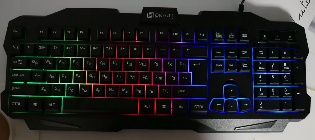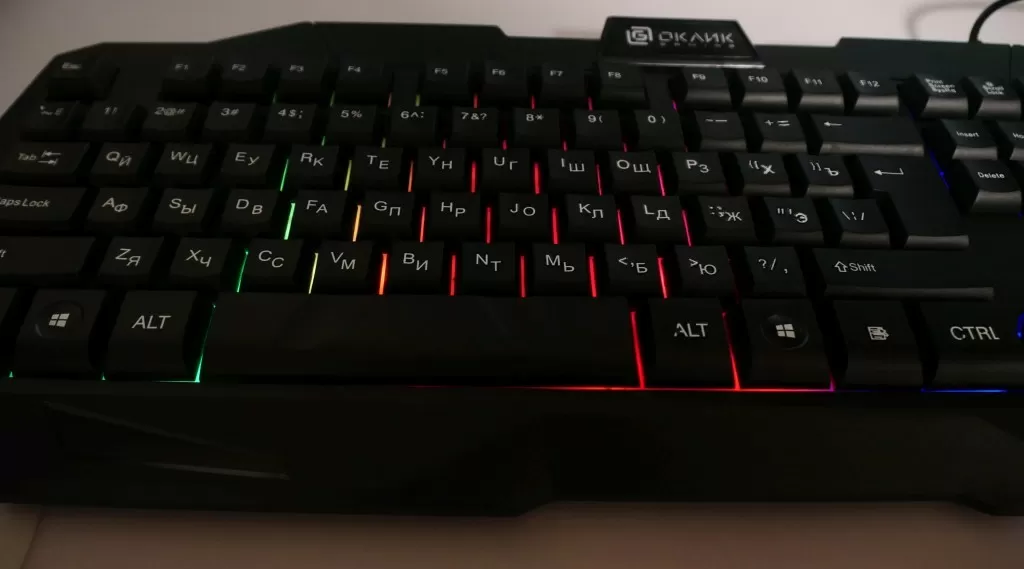Клавиши – мембранные, с подсветкой. Но если у механик обычно символы на клавиатуре – прозрачные, и подсвечиваются в первую очередь именно они, то у мембранных клавиатур свет прорывается через промежутки между клавишами. В ОКЛИК 757G MADNESS вся клавиатура поделена на несколько зон, каждая подсвечивается своим фиксированным цветом. Меня цвета нельзя, да и режим работы всего один, но это вполне ожидаемо.