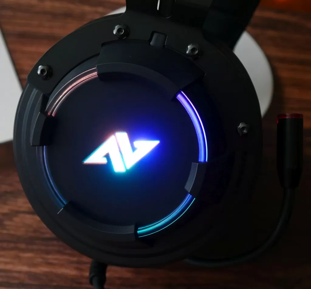 В целом конструкция выглядит очень мощно, все слабые места выполнены из металла, даже места сочленения чашек с оголовьем зафиксированы винтами. Кабель – толстый, резиновый, без оплётки. Оконечен двумя штекерами – аудио 3,5 мм четырёх контактным (то есть можно подключать к смартфону, планшету, ноутбуку, приставкам) и обычным USB, который питает подсветку. Если подсветка не нужна – просто не подключаем USB кабель. И также в комплекте идёт компактная внешняя USB звуковая карта с аудиогнездом, который находится на гибком кабеле. Её предлагается использовать для подключения гарнитуры к компьютерам и ноутбукам.